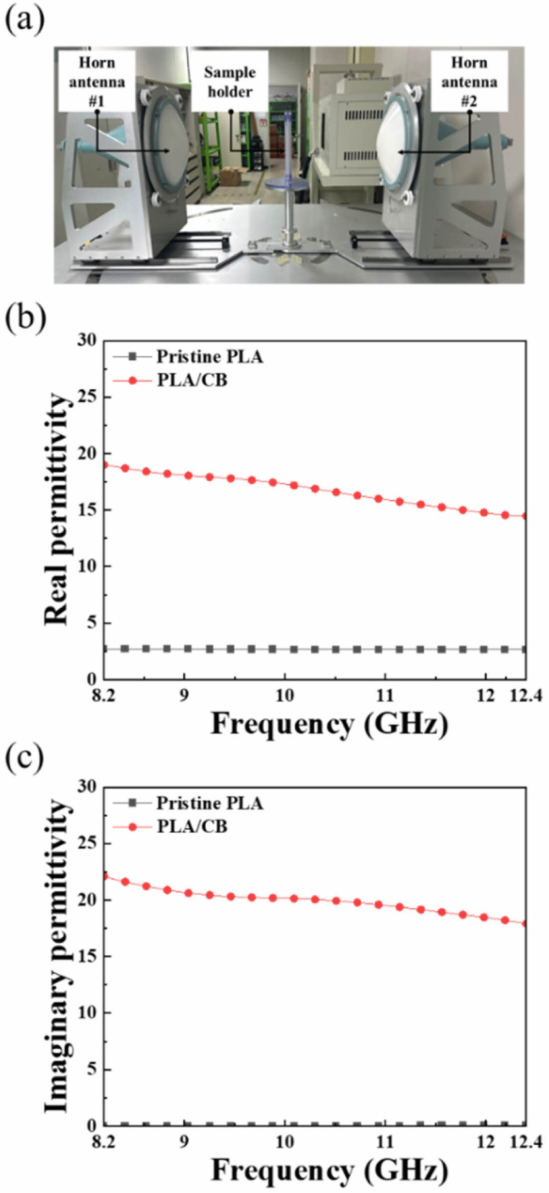 Fig. 4 (a) Free space measurement system, complex permittivity of PLA, PLA/CB (b) real part and (c) imaginary part |