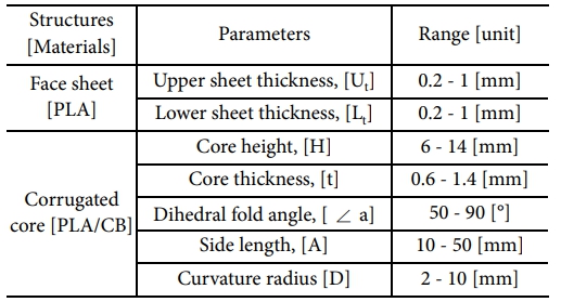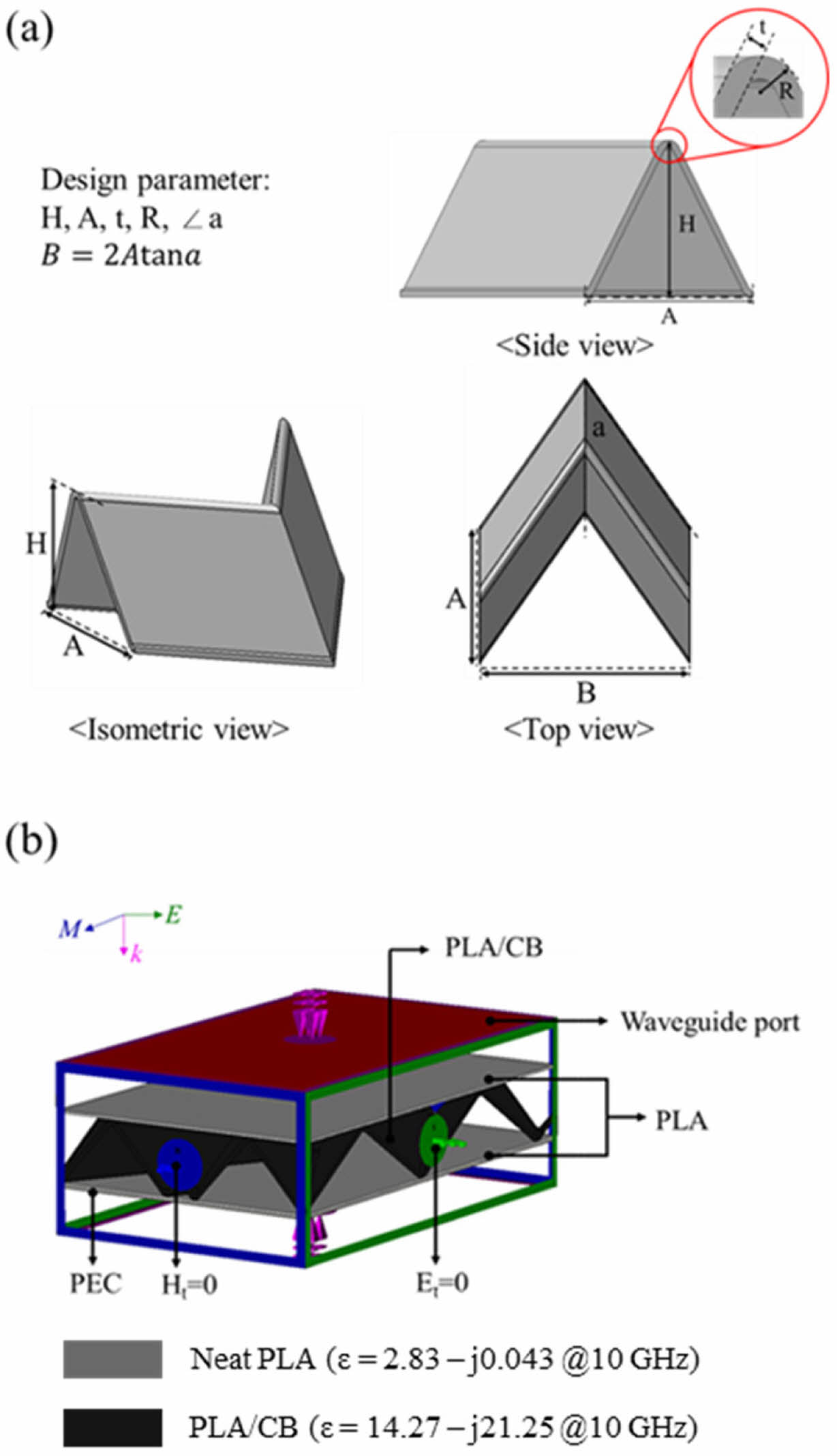 일반적으로 샌드위치 구조는 두 개의 스킨(Skin) 사이에 코어(Core)를 배치한 형태를 가지며 이러한 구조적 특성으로 평면 내의 하중 및 굽힘 하중에 대한 지지 능력이 우수하다. 본 연구에서는 샌드위치 구조의 코어로 코러게이트 코어를 활용하였고 전파의 흡수를 위해 Proto pasta 社의 PLA/CB(Carbon black filled polylactic acid)를 사용하였다. 또한, 샌드위치 코어의 스킨은 표면에서의 임피던스 정합을 위해 복소 유전율이 낮은 Creatbot 社의 PLA (Polylactic acid)를 사용하였다.
