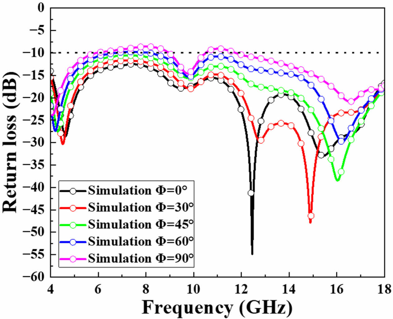 Fig. 8 Simulation results for a corrugated sandwich radarabsorbing structure at each polarization angle |