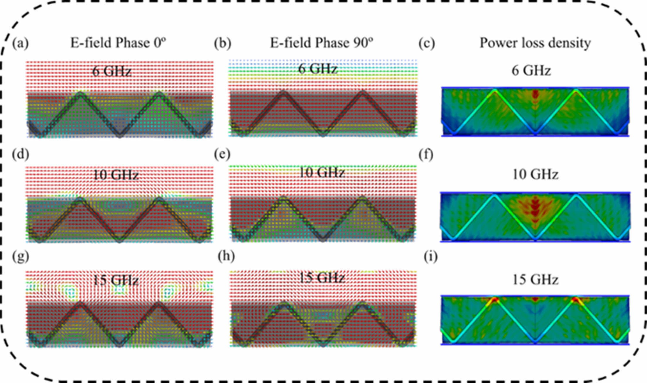 Fig. 9 Strength distribution results of E-field at each phase and power loss density (a, b, c) 6 GHz, (d, e, f) 10 GHz, (g, h, i) 15 GHz |