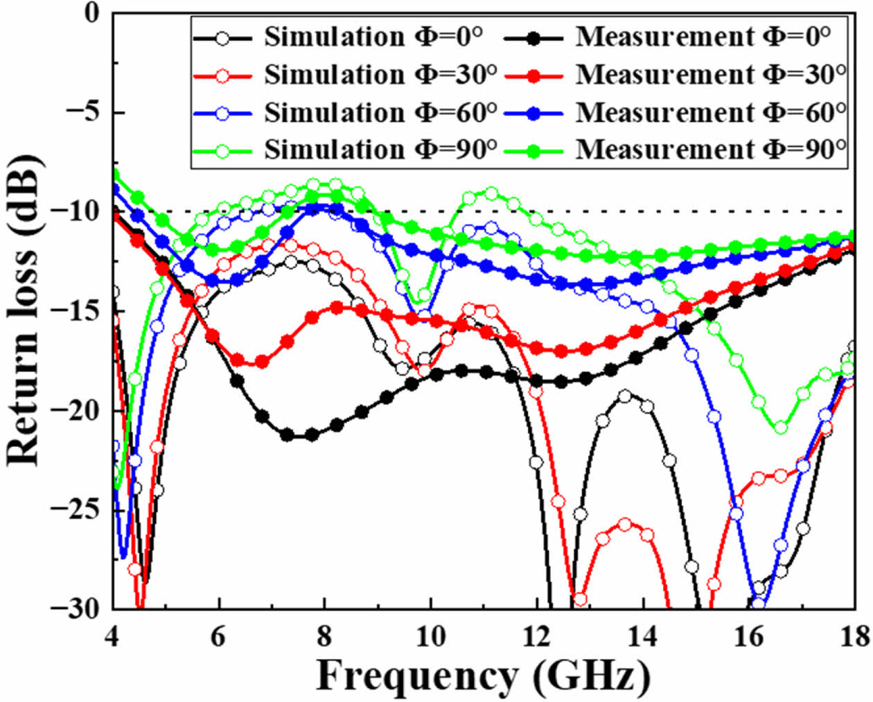 본 연구에서 제안한 구조의 흡수 성능을 확인하기 위해 자유공간 측정 시스템을 이용하여 따른 반사 손실을 측정하였다. Fig. 11에 제시된 흡수체의 반사 손실 곡선은 편파각을 단계적으로 변화시키면서 4-18 GHz 범위에서 자유공간 측정 시스템을 통해 얻은 측정치와 동일 조건에서 수행한 시뮬레이션의 결과를 비교한 것이다. 측정 결과, 편파각이 0°인 경우와 30° 경우 모든 주파수 대역에서 -10 dB 이하의 전파흡수성능이 나타났으나 편파각이 60°인 경우와 90°의 경우 4-4.8 GHz의 구간과 7.3-8.9 GHz를 제외한 모든 주파수 대역에서 -10 dB의 우수한 전파흡수성능이 나타났다. 전자기 해석 결과와 비교하였을 때 반사손실의 최대값 및 주파수에서의 차이가 나타났는데 이는 3D 프린팅 후 표면 거칠기, 출력 방향 및 재료의 복소 유전율 편차 등 다양한 요인 때문이다. 편파각이 0°에서 90°로 커질수록 특정 구간에서 반사손실이 곡선이 완만해져 최저 반사손실이 다소 상승하는 경향이 나타난다. 이는 코러게이트 코어가 비대칭적인 구조적 특성을 지니고 있어 입사되는 전자파가 편파 방향에 따라 내부 경로와 반사, 산란조건이 달라지기 때문이다. 그럼에도 모든 편파각에 대하여 -10 dB 수준의 성능을 폭넓게 유지하여 편파각의 변화에도 안정적인 흡수성능을 보였다.
