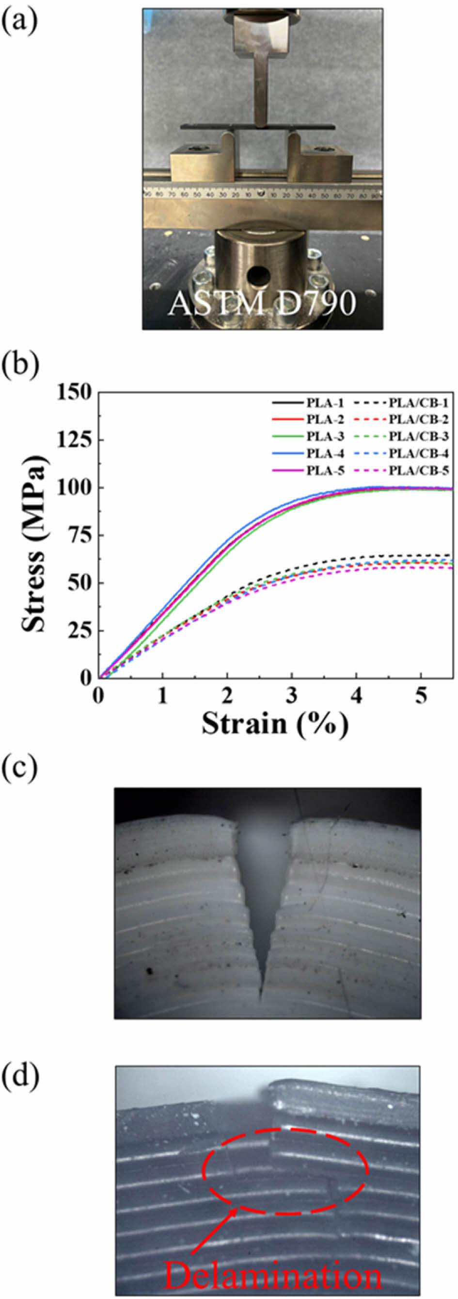 Fig. 12 (a) Three-point bending test setup, (b) stress-strain curves of PLA and PLA/CB specimens, microscopic cross-section of (c) PLA and (d) PLA/CB |