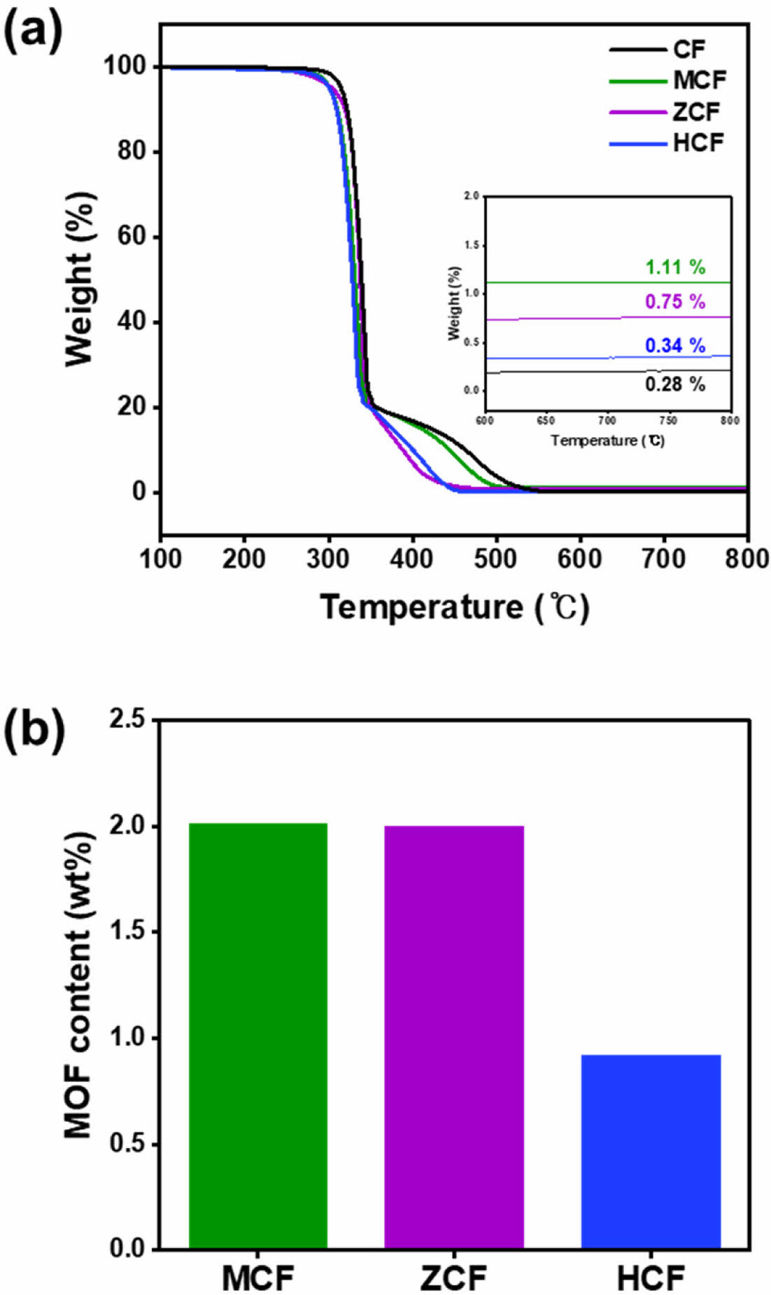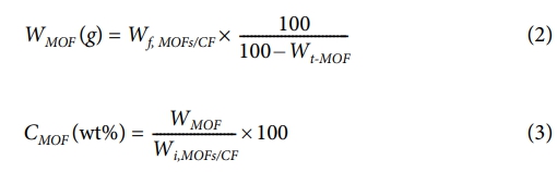 Fig. 7b에서 TGA 측정 결과를 바탕으로 MOFs/CF 내의 MOFs 함량을 아래의 수식 (2)와 (3)에 따라 계산하였다.