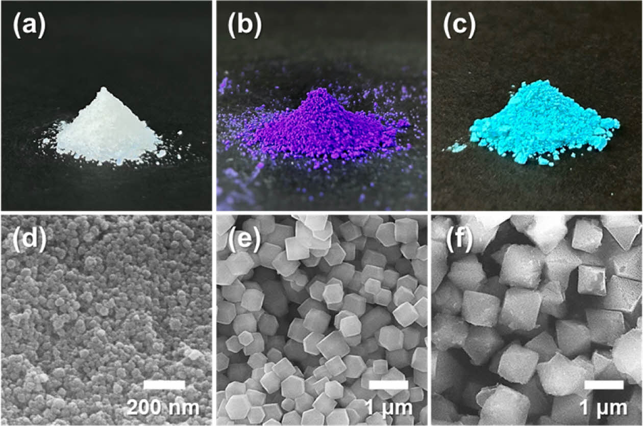 Fig. 2 Optical and FE-SEM images of (a, d) MOF-801, (b, e) ZIF67, and (c, f) HKUST-1 |