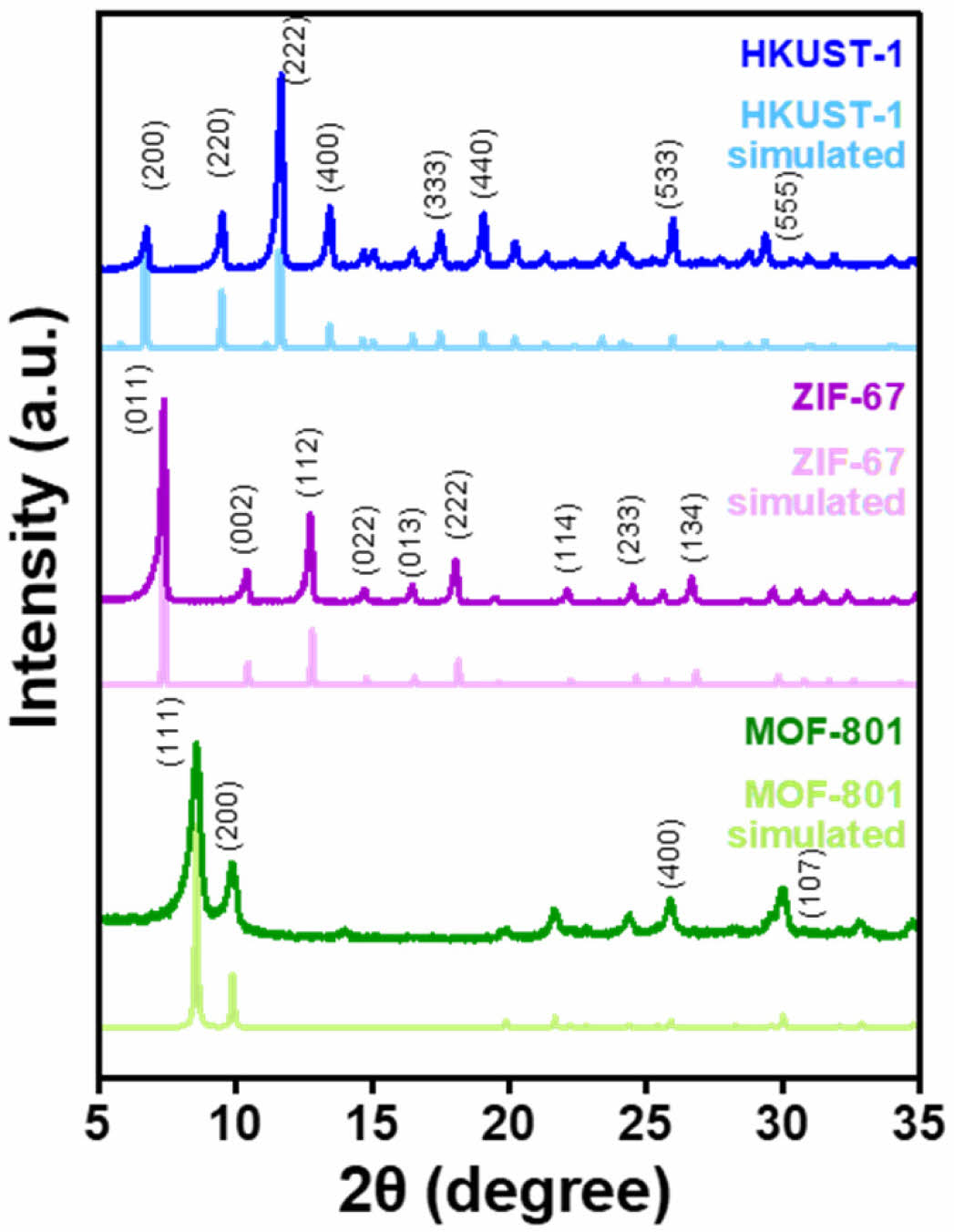 Fig. 3은 합성된 MOF-801, ZIF-67, 그리고 HKUST-1의 결정 구조를 확인하기 위해 수행한 XRD spectra 분석 결과이다. 합성한 MOF-801 XRD spectrum에서는 2θ = 8.5°, 9.9°, 26.0°, 그리고 30.0°에서 피크가 관찰되었으며, 각각 (111), (200), (400), 그리고 (107) 결정면을 나타낸다. 이는 MOF-801의 simulated 패턴의 피크와 일치하는 것으로 확인되었다. 합성한 ZIF-67의 XRD spectrum은 simulated 패턴의 피크와 일치하게 2θ = 7.4°, 10.4°, 12.8°, 그리고 18.0°에서 주요 피크가 나타남을 확인하였으며, 이는 각각 (011), (002), (112), 그리고 (222) 결정면에 해당한다. 합성한 HKUST-1의 XRD spectrum에서는 알려진 주요 피크인 2θ = 6.7°, 9.5°, 그리고 11.5°에서 피크가 관찰되었으며, 이는 (200), (220), 그리고 (222) 결정면과 대응된다. SEM 이미지와 더불어 XRD spectra 측정 결과에서 확인할 수 있듯이, 물 또는 알코올 용매를 사용해 합성한 MOFs가 각 MOFs의 고유한 결정구조를 유지하고, 합성 과정 중 결정상의 변화가 나타나지 않음을 보여준다. 이러한 결과를 통해 기존 합성 공정에 사용되는 DMF 용매를 이용하지 않고, 상온에서 물과 알코올 용매를 이용한 방법으로도 높은 결정성을 지닌 MOFs를 합성할 수 있음을 확인하였다.