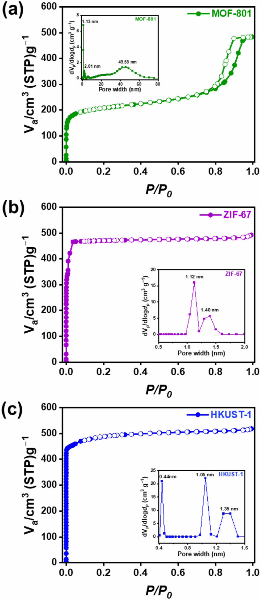 Fig. 4 The N2 adsorption/desorption isotherms and pore size distribution of (a) MOF-801, (b) ZIF-67, and (c) HKUST-1 |