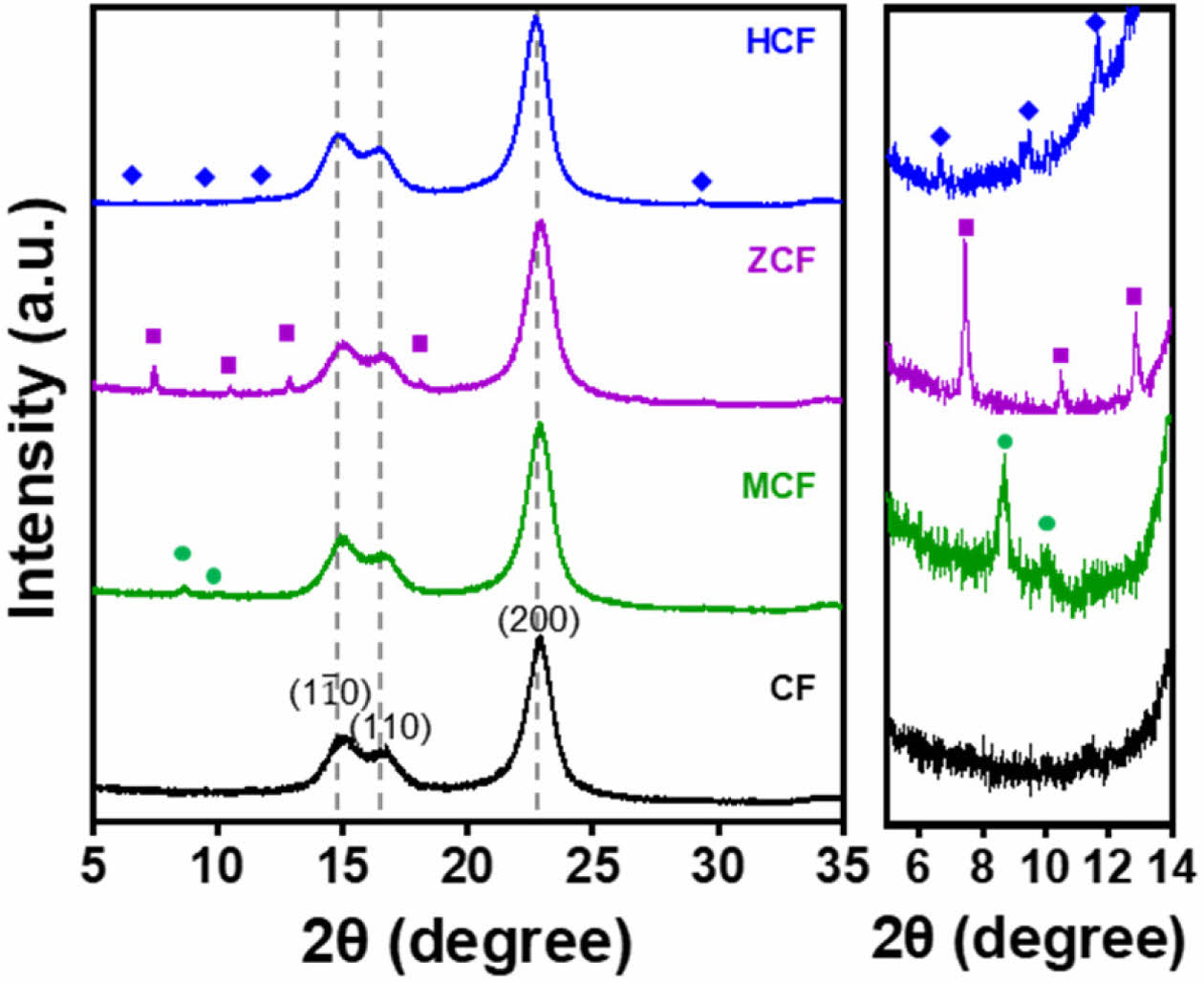 CF 및 MOFs/CF의 XRD 분석 결과를 Fig. 6에 나타내었다. CF 및 MOFs/CF의 XRD spectra에서 공통적으로 확인되는 2θ = 15.0°, 16.7°, 그리고 23.0° 피크는 CF의 피크이며, 각각 (110), (110), 그리고 (200) 결정면을 나타낸다. MOFs의 XRD spectra (Fig. 3)와 비교하였을 때, MCF의 XRD spectrum에서 MOF-801의 2θ = 8.5°, 9.9° 피크가 확인되었다. ZCF XRD 패턴에서 2θ = 7.4°, 10.4°, 12.8° 그리고 18.2° 피크를 확인할 수 있었으며 이는 Fig. 3의 ZIF-67에서 관찰된 결정 피크와 일치함을 확인하였다. 또한, HCF의 XRD spectrum에서 2θ = 6.6°, 9.5°, 그리고 18.2° 피크가 나타났으며, 이는 마찬가지로 Fig. 3에서 확인된 HKUST-1의 spectrum 피크와 동일한 위치에 나타남을 확인하였다. MOFs/CF의 SEM 이미지 (Fig. 5f-h)와 XRD spectra를 통하여 CF 표면에 MOFs를 직접적으로 성장시켜 복합화하는 과정에서 MOFs의 구조적 변형이나 결정 상태 변화가 나타나지 않고, MOFs의 고유한 결정구조를 지속적으로 유지하고 있음을 다시 한 번 확인할 수 있었다. 한편, MOFs/CF의 XRD spectra에서 MOFs 결정 피크의 intensity가 CF의 intensity에 비해 전체적으로 낮은 것으로 나타났는데, 이는 복합체 내에서 코팅된 MOFs 양이 CF에 비해 상대적으로 적기 때문으로 판단된다.