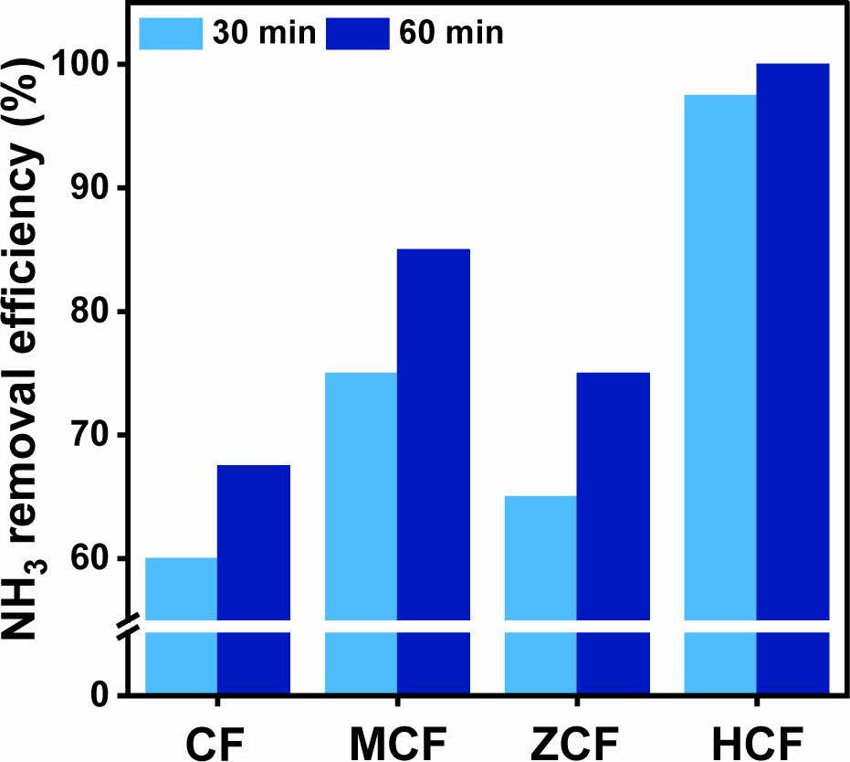 Fig. 8 NH3 removal efficiency of CF and various MOFs/CF |