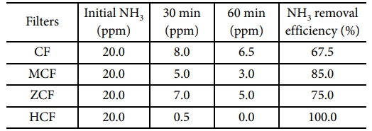 NH3 흡착 제거 효율은 다음과 같이 계산되었다.