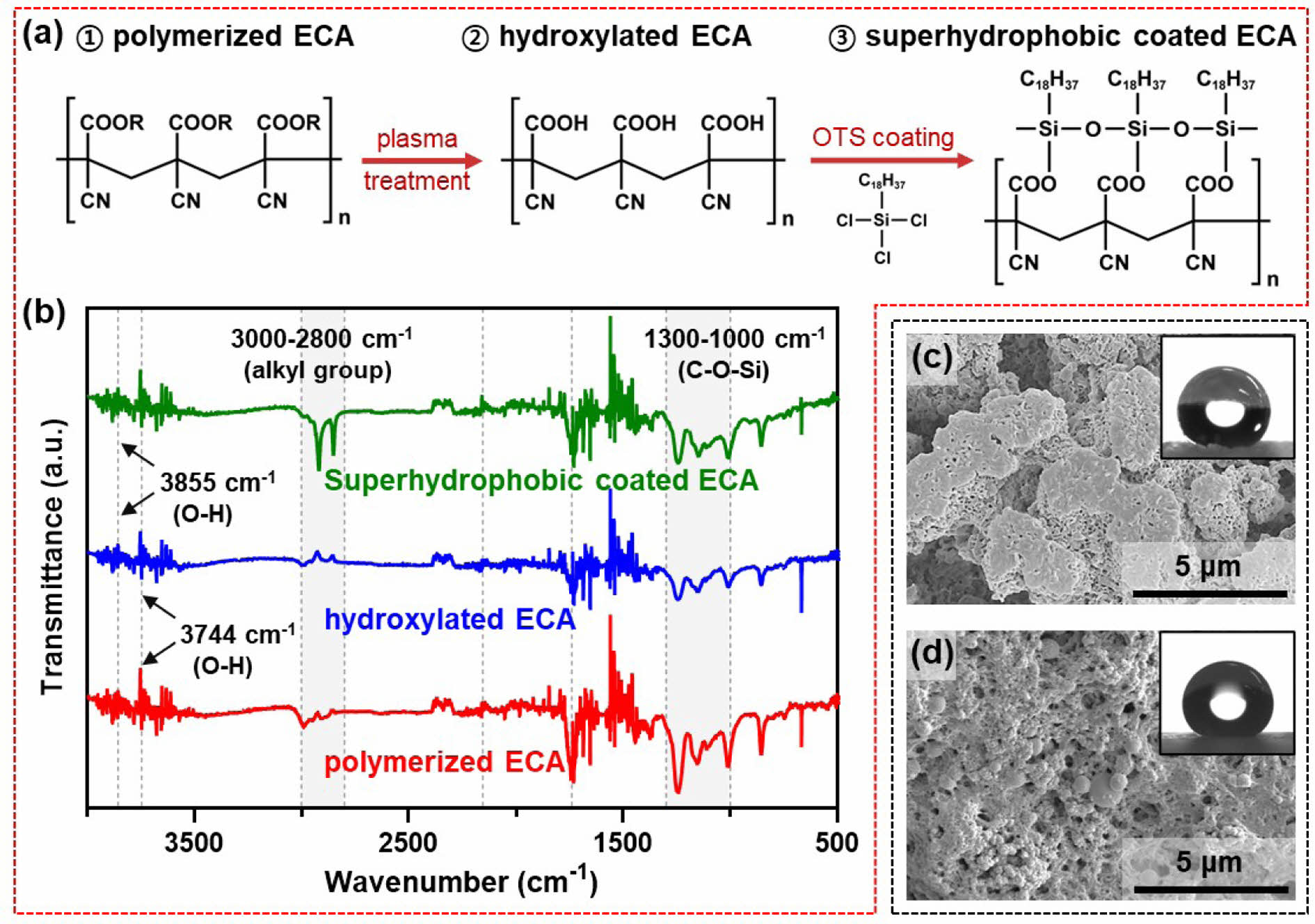 경화촉진제를 이용해 형성된 거대 주름 구조의 표면은 높은 소수성을 보였지만, 초소수성의 기준인 접촉각 150°에는 미치지 못했다. 본 연구에서는 이 문제를 해결하고 초소수성을 달성하기 위해 Fig. 3(a)와 같이 플라즈마 처리와 자기조립 단분자층 코팅을 결합한 추가적인 표면 개질 공정을 도입했다. 경화촉진제 또는 물에 의해 경화된 ECA 중합체는 높은 분자 밀도와 분자량으로 인해 화학 물질의 침투가 어렵고, 표면에 새로운 기능기를 도입하는 데 제약이 따른다. 플라즈마 처리는 ECA 중합체 표면의 고분자 사슬 결합을 끊어 반응성이 높은 수산기(-OH) 및 카르복실기 (-COOH)와 같은 작용기를 형성한다[12]. 이 작용기들은 이후 진행될 소수성 물질 코팅 시, 코팅 물질이 표면에 견고하게 부착되도록 돕는 ‘앵커’ 역할을 하여 표면의 소수성을 극대화한다. 소수성 코팅 물질로는 긴 알킬 사슬(C18)을 가져 표면에너지가 낮은 n-옥타데실트리클로로실란(OTS)을 사용하였다[13]. 코팅 과정에서 OTS 분자 내 실란기는 주변의 미량 수분과 반응하여 가수분해되면서 실라놀(Si-OH) 그룹을 형성한다. 이 실라놀 그룹은 플라즈마 처리를 통해 표면에 생성된 수산기와 탈수 축합 반응을 일으켜 안정한 실록산(Si-O-Si) 결합을 형성함으로써, OTS 분자를 표면에 화학적으로 고정시킨다. 이어서 표면이 건조되는 동안 긴 알킬 사슬들이 자발적으로 정렬하여 균일한 소수성 단분자층을 만들고, 이는 표면 에너지를 크게 낮추어 초소수성을 달성하게 한다. 추가 공정에서의 단계별 화학적 변화를 추적하고 초소수성 표면의 형성 메커니즘을 규명하기 위해 ATR-FTIR 분석을 수행했다(Fig. 3(b)). 순수 중합된 ECA 샘플에서는 1732 cm-1와 2160 cm-1에서 뚜렷한 흡수 피크가 관찰되었으며, 이는 ECA 모노머로부터 유래한 에스터 각각 에스터(-COOEt)와 시아노(-C≡N) 그룹에 해당한다[14]. 또한 3744 cm-1에서 미약한 수산기(-OH) 신호가 검출되었는데, 이는 경화촉진제 또는 물이 시아노 또는 에스터 그룹과 반응하여 소량의 수산기를 형성했음을 암시한다[10]. 플라즈마 처리 후에는 3744 cm-1와 3855 cm-1에서 수산기 그룹과 관련된 피크가 더 명확해졌으며, 카보닐 및 시아노 그룹 영역의 피크 강도 변화를 통해 표면 산화가 진행되었음을 확인했다[15]. 하지만 예상과 달리 수산기 피크의 폭발적인 증가는 관찰되지 않았는데, 이는 플라즈마에 의해 생성된 표면의 수산기가 시간이 경과함에 따라 고분자 사슬의 동적 거동에 의해 내부로 재배열되었기 때문으로 판단된다. 마지막 OTS 코팅 후, OTS의 트리클로로실란 그룹이 표면 수산기와 반응하여 형성된 안정한 Si-O-Si 결합은 1000–1300 cm-1 영역에서 C-O-Si 결합 신호의 강도 증가로 확인되었다. 또한, OTS의 알킬 사슬 도입으로 인해 2800–3000 cm-1 영역의 알킬 그룹(C-H 스트레칭) 신호가 현저히 강화되었다[16]. Fig. 3(c)와 (d)는 플라즈마 처리 및 OTS 코팅 후의 표면 형상과 젖음성을 각각 보여주는 전자현미경 이미지와 물방울 접촉각 사진이다. 이 결과들은 초소수성 구현을 위한 추가 공정이 기존의 표면 구조에 큰 영향을 미치지 않았음을 보여준다. 반면, 접촉각은 크게 향상되어 경화촉진제로 유도된 표면에서는 157.4°, 물로 유도된 표면에서는 151.6°를 기록하여 두 경우 모두 성공적으로 초소수성이 구현되었음을 입증했다.