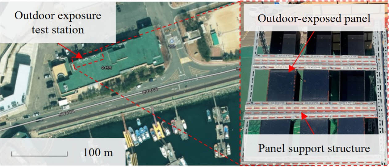 시편은 2017년부터 2024년까지 8년간 해안과 100 m 이내 인접한 곳에 설치된 실외 시험소에서 자연환경에 노출시켰다. 해안과 인접한 위치로 인해 고온다습한 해양성 기후의 영향을 지속적으로 받는 지역이며, 시편에는 자외선, 고습도, 강우, 해풍 등 복합적인 환경 인자가 동시에 작용한다. Fig. 3에 제시된 패널 거치용 구조물은 지붕과 측면 차폐가 없는 개방형 구조로 설계되어 바람, 자외선, 습도, 염분 등 외부 인자에 시편이 직접 노출될 수 있는 환경을 제공한다. 또한 시편 고정부에는 갈바닉(galvanic) 부식 방지를 위해 실리콘 코팅을 적용하였고 빗물이나 세척수가 패널 표면에 고이지 않도록 경사진 지지 구조를 설계하였다.