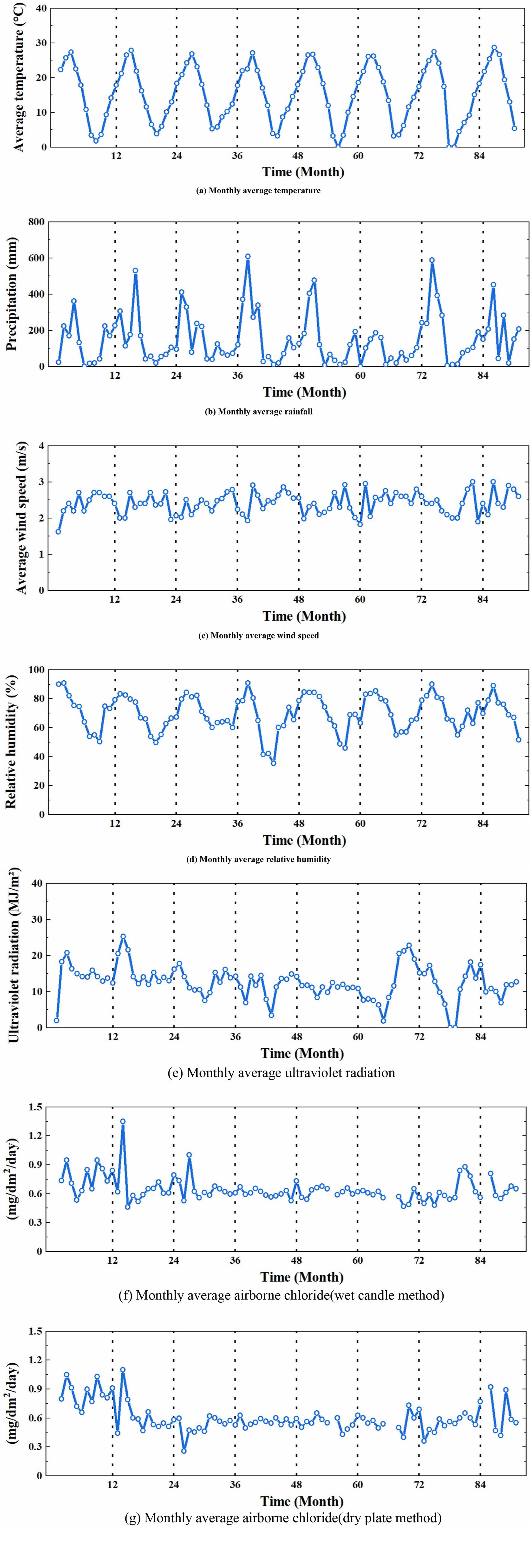 Fig. 5 Monthly recorded environmental conditions: (a) ambient temperature, (b) rainfall, (c) wind speed, (d) relative humidity, (e) ultraviolet radiation, (f) airborne chloride(wet candle method), and (g) airborne chloride(dry plate method) |