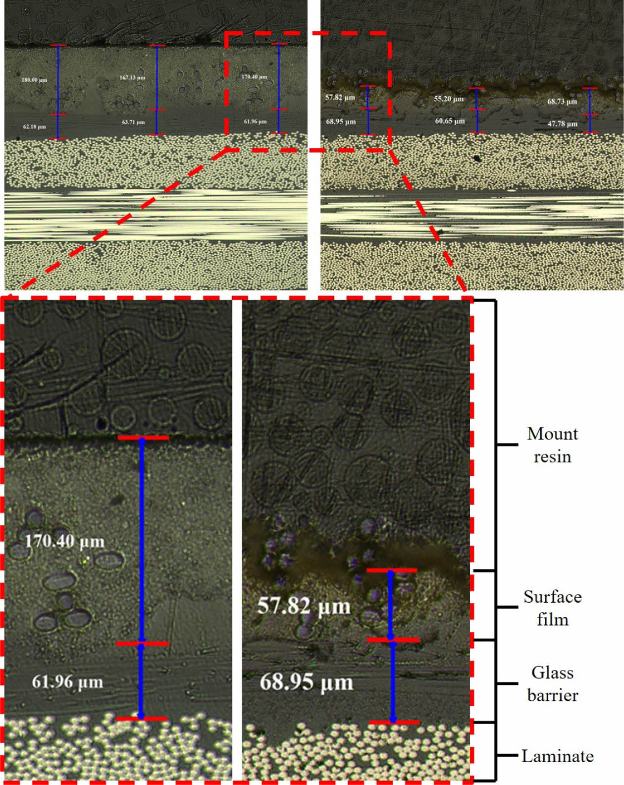 가공된 시편은 에폭시 수지로 마운팅한 후 연마하여 단면 구조 관찰이 용이하게 하였다. 이후 광학현미경을 사용하여 시편의 단면 구조를 관찰하였으며, 필름의 두께를 측정하여 열화 양상을 정량적으로 평가하였다.