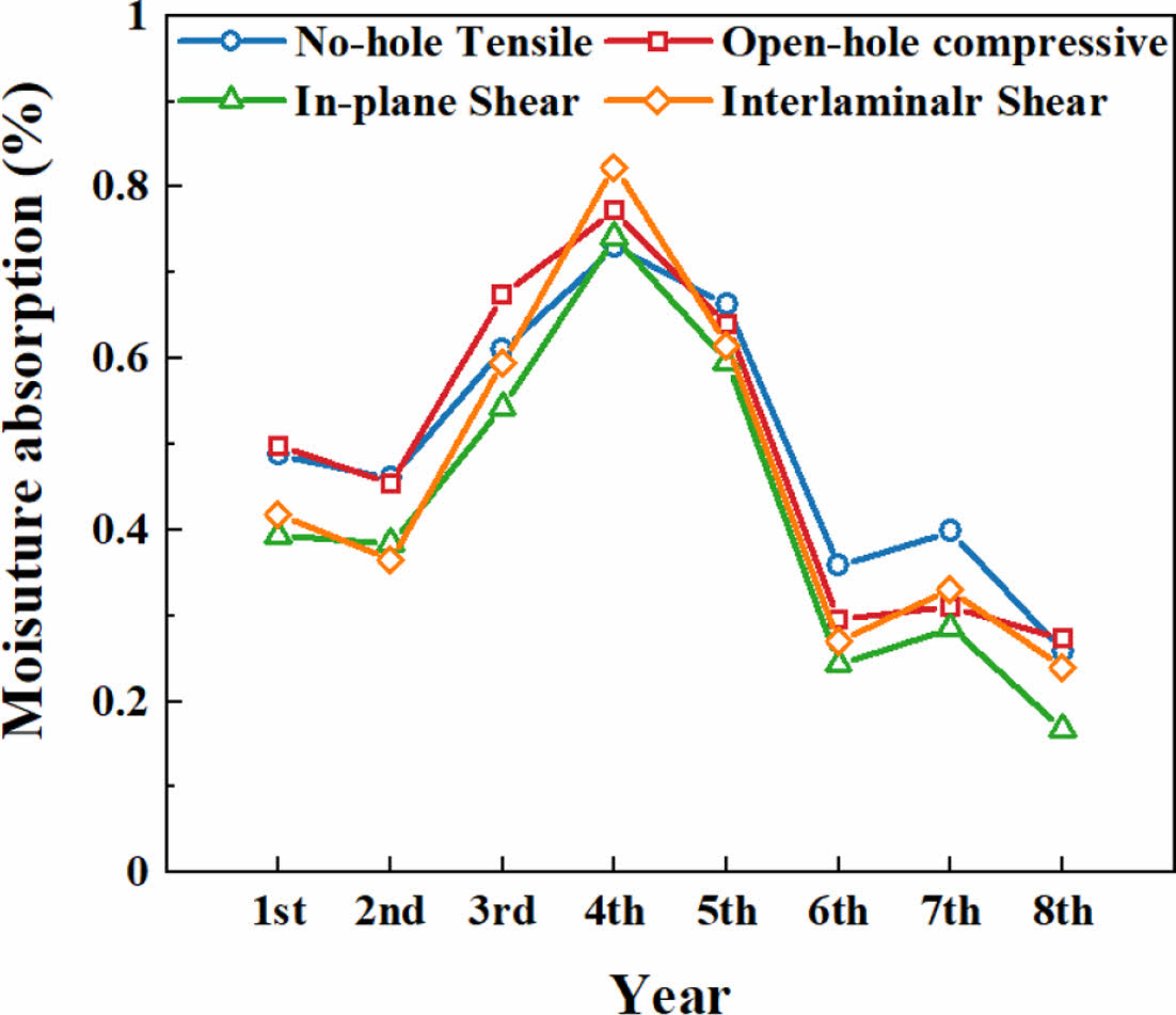 흡습량은 노출 초기(1-4차년)에는 증가하였으나, 5차년도 이후에는 감소하는 경향이 나타났다. 이는 수지의 구조적 변화 및 확산 경로의 변화로 기인한 것으로 해석된다. 이와 같은 흡습 변화에 따라 기계적 특성은 일정 수준에서 안정화되었고 인장 및 압축 강도는 최대 5% 이내, 면내전단 및 층간전단 강도는 ±10% 범위에서 유지되었다.