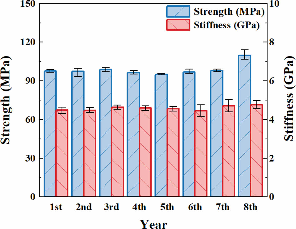 적층판 인장 시험을 통해 기준년도부터 8차년도까지의 연차별 기계적 특성 변화를 분석하였다. 시험 결과는 Fig. 8에 나타내었다. 인장 강도는 기준 연차 대비 ±2% 범위 내에서 7차년도까지 큰 변화가 없었으며, 8차년도에는 약 5% 감소하였다. 인장 강성은 기준 연차 대비 ±3% 범위 내에서 유지되어 통계적으로 유의미한 변화는 관찰되지 않았다. 강도와 강성 모두 장기간 자연환경 노출에도 비교적 안정적인 특성을 나타냈다.