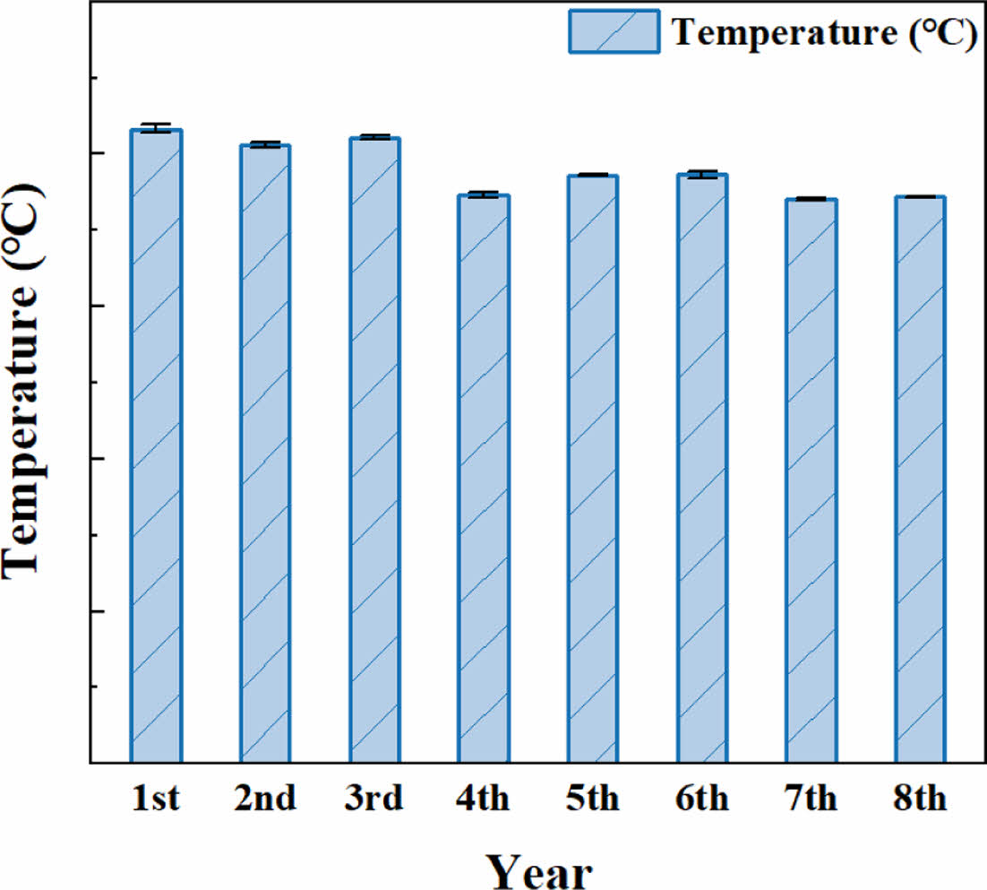 Tg 측정 결과를 통해 연차별 수지의 열적 특성 변화를 분석하였다. 시험 결과는 Fig. 16에 나타내었다. Tg는 1차년도부터 4차년도까지 기준 연차 대비 약 −4% 내외 범위에서 안정적으로 유지되었으나, 4차년도 이후부터는 지속적인 감소 경향이 나타났다. 특히 4차년도부터 7차년도까지는 기준 연차 대비 약 8-12% 수준으로 감소하였으며, 8차년도 시편에서도 약 12% 감소가 확인되었다. Tg의 이와 같은 감소는 수지 기지 내 분자 사슬의 절단, 가교 밀도 감소, 수분 흡수에 의한 가소화 효과 등과 관련된 열화 반응의 진행을 반영하는 것으로 해석된다[28]. 이러한 결과는 장기간 자연환경 노출에 따른 수지의 화학적 열화가 누적적으로 발생하였음을 의미한다.