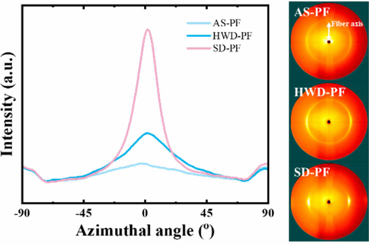 Fig. 1 2D-XRD azimuthal scan profiles of precursor fibers (AS-PF, HWD-PF, and SD-PF) prepared by each drawing process |