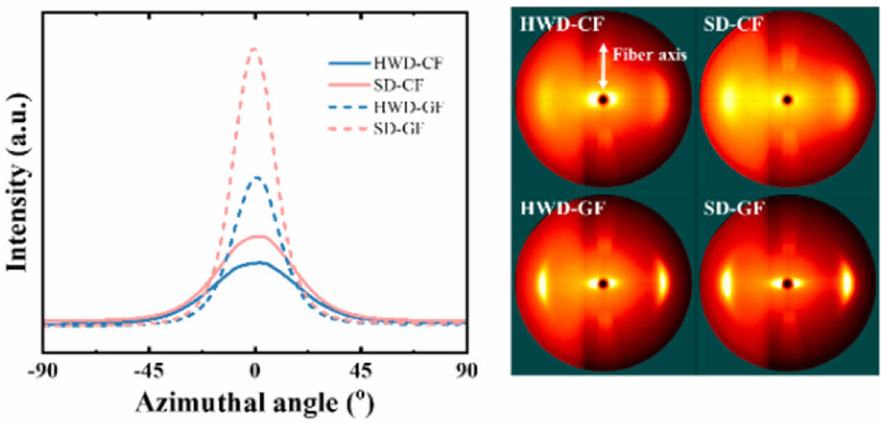 Fig. 2는 열처리를 거친 두 시료 탄화섬유(HWD-CF, SD-CF)와 흑연화섬유(HWD-GF, SD-GF)에 대해, 그래핀 (002)면(약 2θ = 25° 부근)의 2D-XRD 방위각 스캔 결과를 비교한 것이다. 탄화 및 흑연화 과정 후, 2θ = 17°에서 피크는 없어지고, 두 시료 모두 (002)면 회절 고리가 뚜렷하게 관찰되며, 이러한 결과는 안정화 후 나타나는 유사흑연구조(pre-graphitic structure)로 보이며 PAN 전구체의 CN 결합이 고리화가 이루어지면서 C=N 결합으로 변환된 것에 기인한 것이다[21]. 또한, 그 회절 강도가 섬유 적도 방향으로 집중된 패턴을 보여 그래핀 층들이 섬유 축과 평행하게 정렬되었음을 나타낸다[22]. 배향 정도를 정량화한 배향계수를 살펴보면, 탄화섬유 단계에서 HWD-CF는 약 0.76, SD-CF는 약 0.78로, 스팀 연신 섬유가 다소 더 높은 배향계수를 보였다(Table 1). 이는 전구체 단계에서의 고분자 사슬 배향 정도가 탄화 후에도 일정 부분 유지되어, SD-CF에서 섬유 내 결정구조의 (002)면이 HWD-CF보다 섬유축 방향으로 보다 정렬되었음을 시사한다. 한편, 흑연화 처리(2600℃)를 거치면서 두 시료의 배향계수가 모두 크게 상승하여, HWD-GF는 0.86, SD-GF는 0.88의 값을 나타냈다. 고온 열처리를 통해 전반적인 결정구조 배향이 증대된 가운데, SD-GF가 HWD-GF보다 여전히 높은 배향성을 유지하고 있다. 즉, 스팀 연신을 통해 얻은 초기 전구체의 우수한 배향성이 최종 흑연화섬유에서도 일정 부분 보존되어, 결과적으로 흑연기저면의 섬유축과 평행하는 방향으로의 배향성을 더욱 향상시키는 데 기여함을 보여준다.