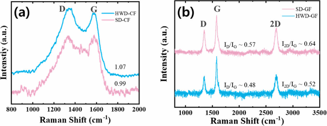 Raman 분석: 라만분광분석(Raman spectroscopy, LabRam GR UV/Vis/NIR, Horiba, Japan)은 514 nm 레이저를 이용하여 탄소섬유의 흑연 구조 평가에 수행되었다. D 밴드(~1350 cm-1)와 G 밴드(~1580 cm-1)의 강도비 (ID/IG)는 구조 내 결함 및 비정질 탄소의 상대적 함량을 나타내는 지표로 사용되었으며, 2D 밴드(~2700 cm-1)의 출현 및 상대 강도 비율 (I2D/IG)은 3차원 흑연 구조 발달 정도를 나타내는 지표로 활용되었다.