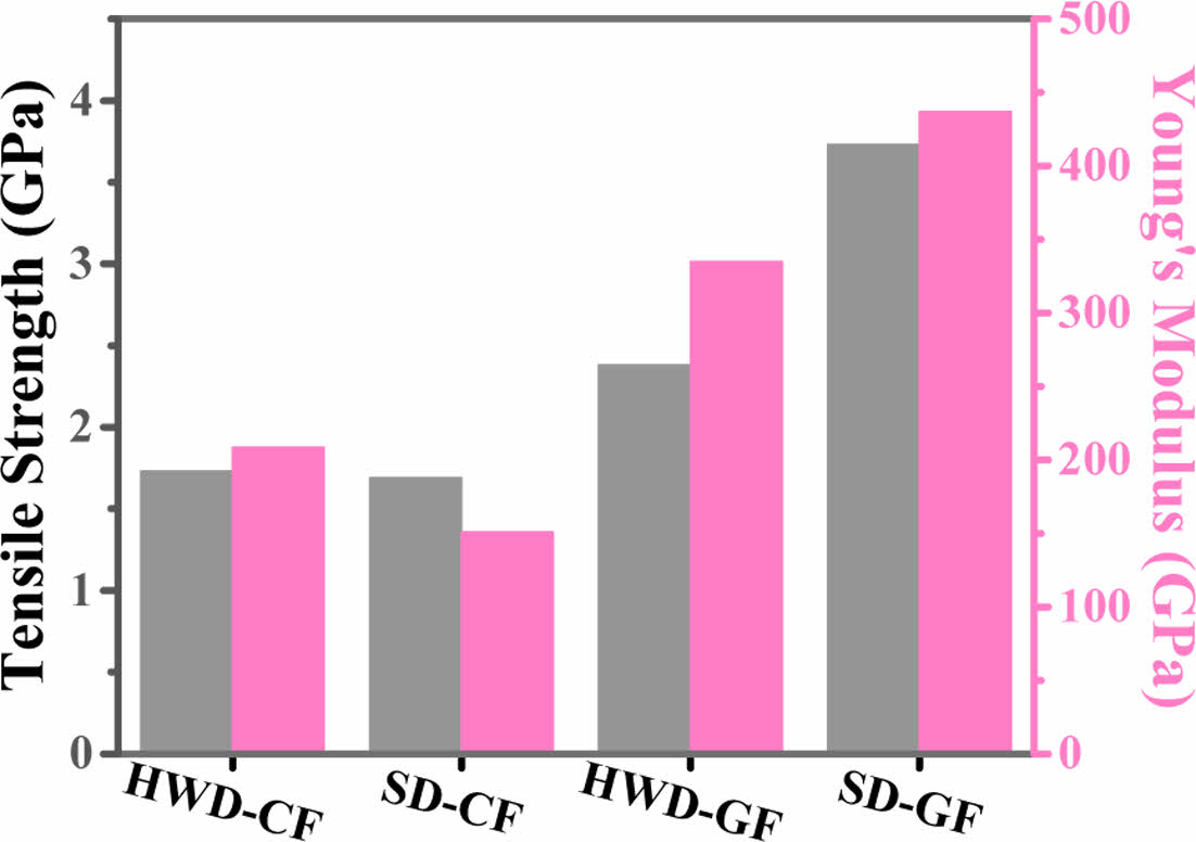 Fig. 6 Tensile strength and Young’s modulus of carbon and graphitized fibers (HWD-CF/GF and SD-CF/GF) |