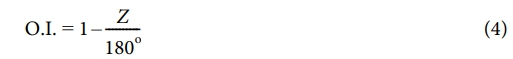 2D XRD 분석: 연신공정에 따른 각 공정별 섬유의 배향도를 측정하기 위하여 2차원 X-선 회절 분석(2 Dimensional X-ray Diffraction, 2D-XRD)은 다목적 X-선 회절분석기(Multi-Purpose X-Ray Diffractometer, D8 DISCOVER, Bruker, Germany)에 VANTEC-500 2D 탐지기(2D detector)를 장착하여 수행하였다. PF 섬유의 경우 PAN의 (100) 면에 해당하는 약 17° 부근, CF와 GF의 경우 탄소 결정의 (002) 면에 해당하는 약 25° 부근에서 방위각(azimuthal angle) 스캔을 진행하여 2D XRD 패턴을 획득하였다. 측정된 2D XRD 패턴에서 확인된 회절 피크의 FWHM인 Z 값을 이용하여 다음 식(4)에 대입하여 배향 계수(Orientation Index, O.I.)를 계산하였다[18,19].