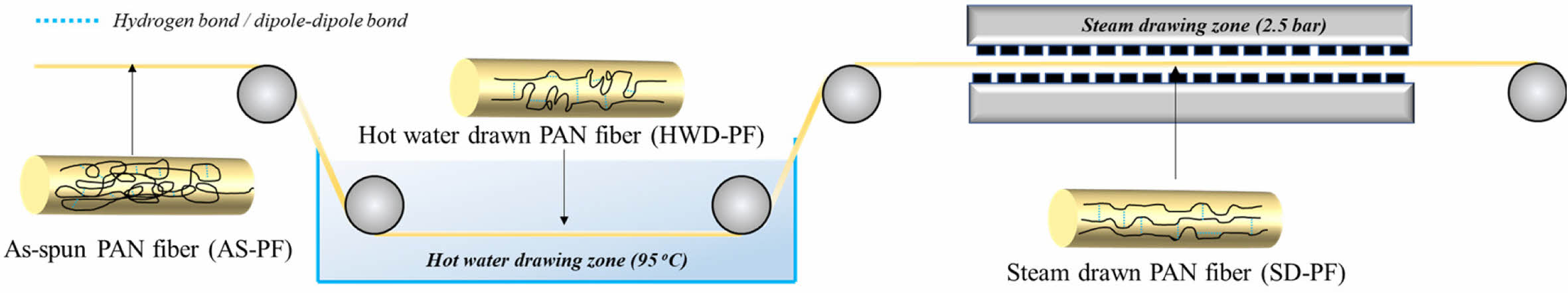 Keywords: 폴리아크릴로니트릴(Polyacrylonitrile), 탄소섬유(Carbon fiber), 고탄성(High modulus), 스팀 연신(Steam drawing), 열수 연신(Hot-water drawing)