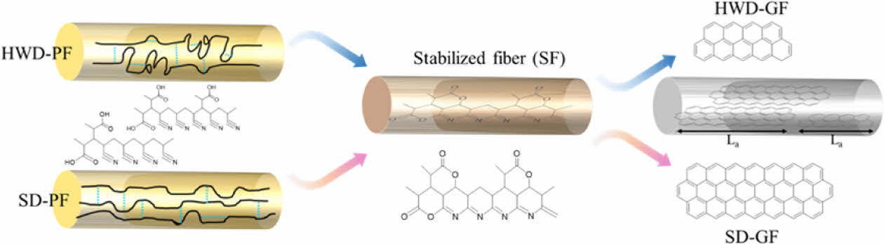HWD- and SD-based PAN fibers during carbonization and graphitization