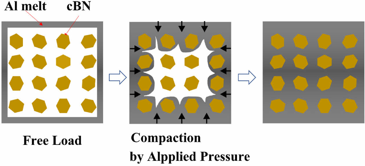 cBN/Al1050 복합재료를 제조하기 위해 50 × 50 × 20 mm³의 금형 내부에 강화재 함량을 60 vol.%로 설정하여 입도별(15, 100, 300 μm) cBN 분말과 Al1050 판재를 적층하였다. 이후 금형을 액상가압장비에 장입한 뒤 승온 속도 5oC/min으로 700oC까지 가열하여 Al1050 기지를 용해하였고, 가압을 통해 체적률 60 vol.%의 입도별 cBN/Al1050 복합재료를 제조하였다. 본 연구에서 이용한 액상가압공정의 모식도를 Fig. 2에 나타내었다.
