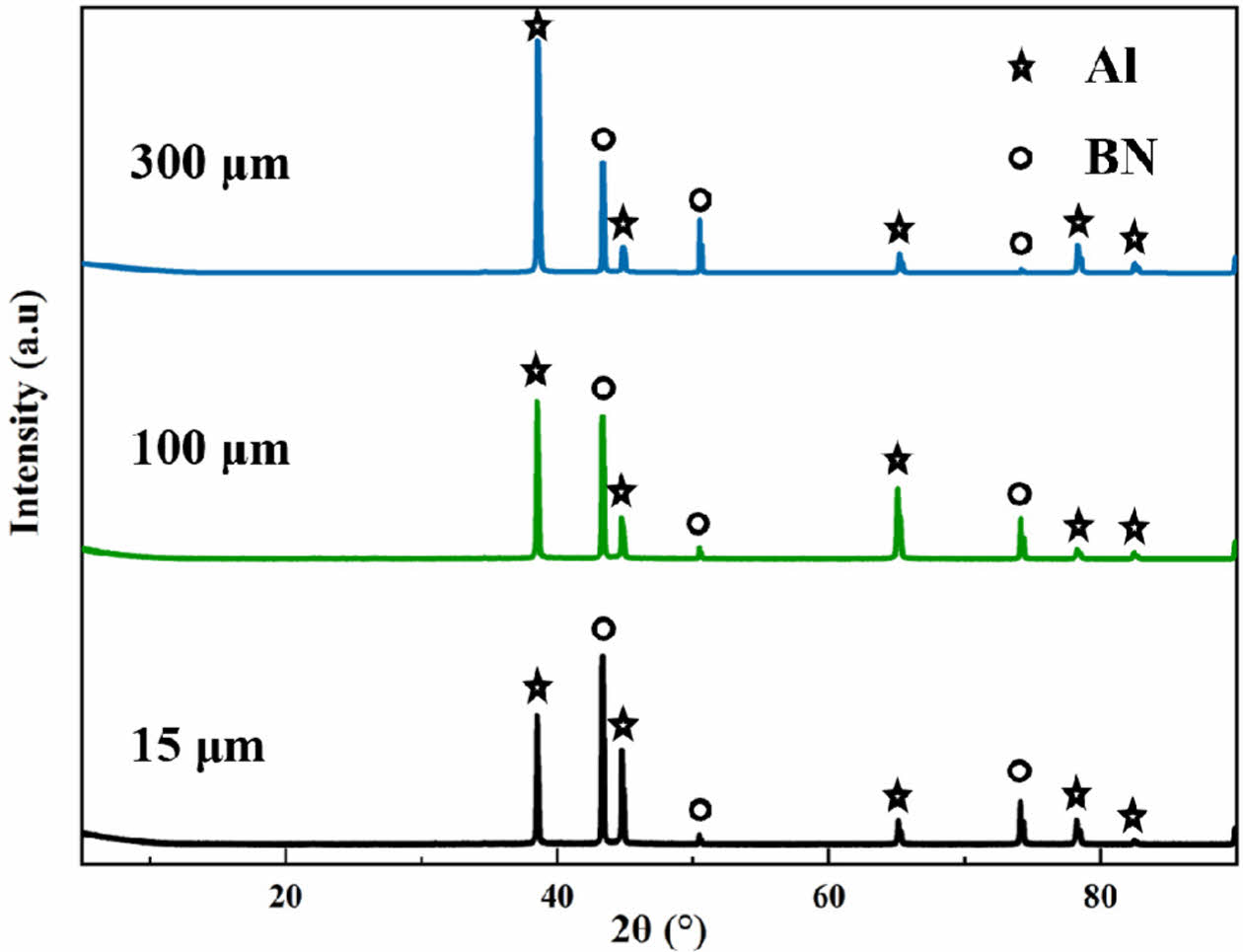 cBN/Al1050 복합재료의 열전도도 측정 결과를 Fig. 8에 나타내었다. 실험결과 15 μm cBN/Al1050 복합재료의 열전도도는 240.07 W/mK로 가장 낮았으며, 100 μm cBN/Al1050 복합재료는 280.88 W/mK, 300 μm cBN/Al1050 복합재료는 324.11 W/mK로 확인되었다. 이를 통해 cBN 입자 크기가 증가할수록 열전도도가 향상되는 경향을 확인하였고, cBN의 입자 크기가 15 μm에서 300 μm로 증가하였을 때 약 35%의 열전도도가 증가하는 것을 확인하였다.