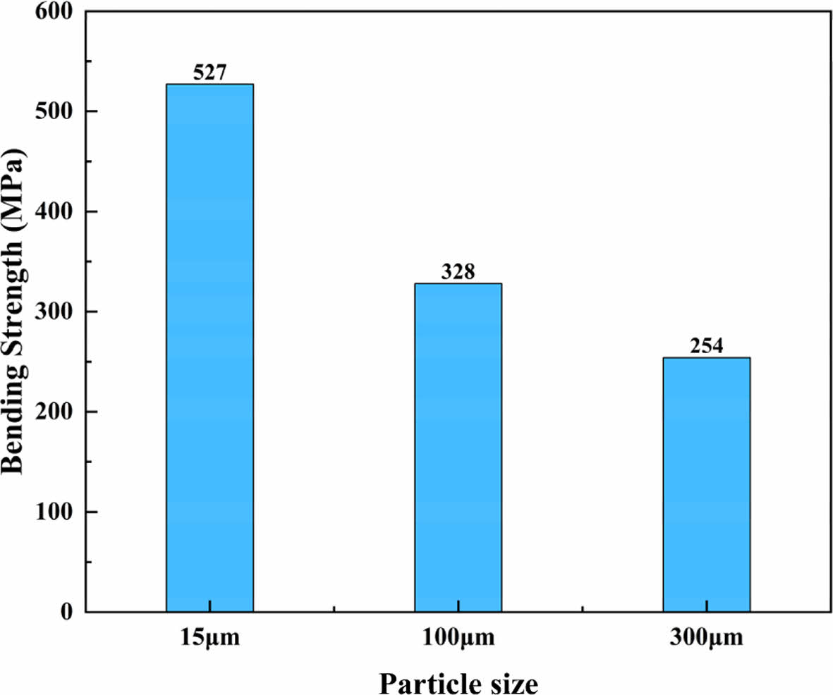 굽힘 시험 결과, 15 μm cBN/Al1050 복합재료의 굽힘 강도는 527 MPa로 가장 높았으며, 파단면 분석을 통해 cBN과 Al의 계면 결합력이 우수한 것을 확인하였다. 이를 통해, 입자 크기가 감소함에 따라 기지재와 강화재의 계면의 증가로 인하여 굽힘 강도가 향상되는 경향을 확인하였다.