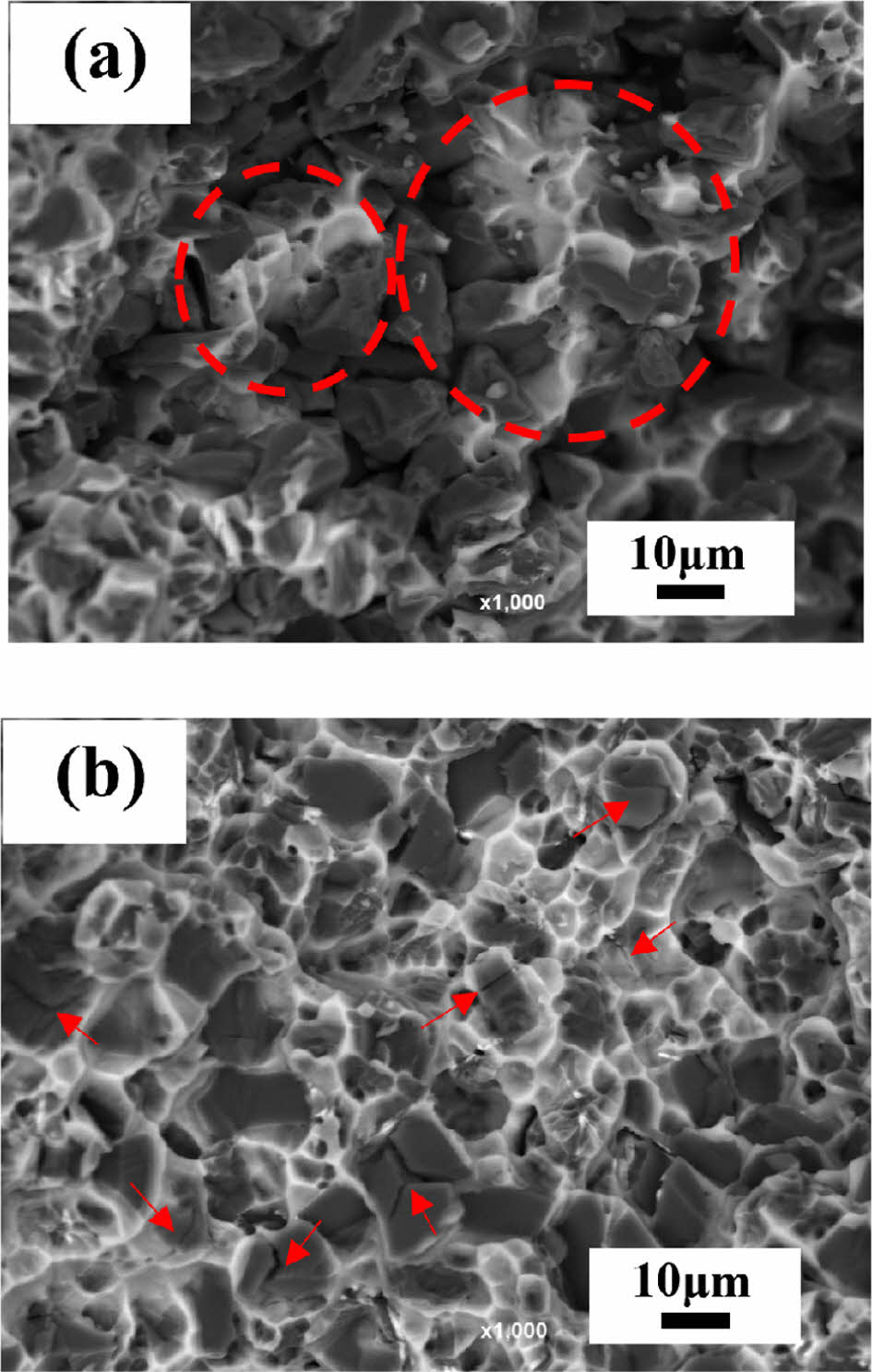 Fig. 6은 굽힘강도가 가장 우수한 15 μm cBN/Al1050 복합재료의 파단면을 주사전자현미경으로 관찰한 결과이다. Fig. 6(a)는 파단면의 단면을 관찰한 이미지로, 빨간색 원으로 표시된 부분에서 확인할 수 있듯이, 강화재와 기지가 강하게 결합되어 있는 형상이 관찰된다. 한편, Fig. 6(b)는 파단면의 수직 방향에서 관찰한 결과로, 빨간색 화살표로 표시된 부분에서 주로 cBN 입자가 내부에서 파단이 발생한 것을 확인할 수 있다. 이는 외부 하중이 강화재에 효과적으로 전달되어 계면이 아닌 입자 내부에서 파괴가 일어났음을 의미한다. Fig. 6(a)에서 확인된 바와 같이, 강화재와 기지 금속 간의 강한 계면 결합으로 인해 외부에서 하중이 가해졌을 때 하중이 효율적으로 강화재로 전달되어 cBN 입자의 파괴로 이어진 것으로 판단된다. 이러한 파단면 분석 결과를 통해 제조된 cBN/Al1050 복합재료가 우수한 계면 결합 특성을 지니고 있음을 확인하였다. 또한, 입자 크기가 작을수록 더 많은 수의 cBN 입자가 기지 내에 균일하게 분산되어 있으며, 이로 인해 하중이 효과적으로 분산되어 파괴가 지연된 것으로 판단된다. 이에 따라 입자 크기가 가장 작은 15 mm cBN/Al1050 복합재료에서 가장 높은 굽힘강도를 나타내었으며, 입자 크기가 증가할수록 굽힘강도가 감소하는 경향을 보였다. 한편 문헌에 따르면, 입자 강화 금속복합재료에 대한 변형구배 이론 해석을 통하여 동일한 체적률 조건에서 입자 크기가 감소할수록 기지 내에 더 큰 변형구배가 형성된다고 보고하였다[12]. 이로 인해 전위 밀도가 증가하며 기지 금속의 유효 경화계수가 상승하고, 그 결과 항복 응력과 유동 응력이 증가한다고 설명하였다[12,13]. 이러한 문헌의 보고 내용은, 본 연구에서 관찰된 입자 크기 감소에 따른 복합재료의 강도 증가 경향과 일치한다.