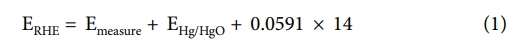 모든 전기화학 측정은 전기화학 분석기(Autolab PGSTAT204)를 이용하여 3 전극계에서 진행하였다. 제작한 자체 지지형 전극(1×1 cm²)은 홀더에 장착하여 작업 전극으로 사용했다. 보조 전극으로는 Pt mesh(1×1 cm²), 기준 전극으로는 Hg/HgO를 사용하였으며, 전해질은 1.0 M KOH(pH=14)를 사용하였다. 모든 전위는 가역 수소 전극 기준(VRHE)으로 변환하였으며, 전위는 아래 방정식을 사용하여 변환하였다. 여기서 Emeasure은 실험적으로 측정된 전위이고, EHg/HgO는 기준전극의 전위(0.097 VSHE)이다.