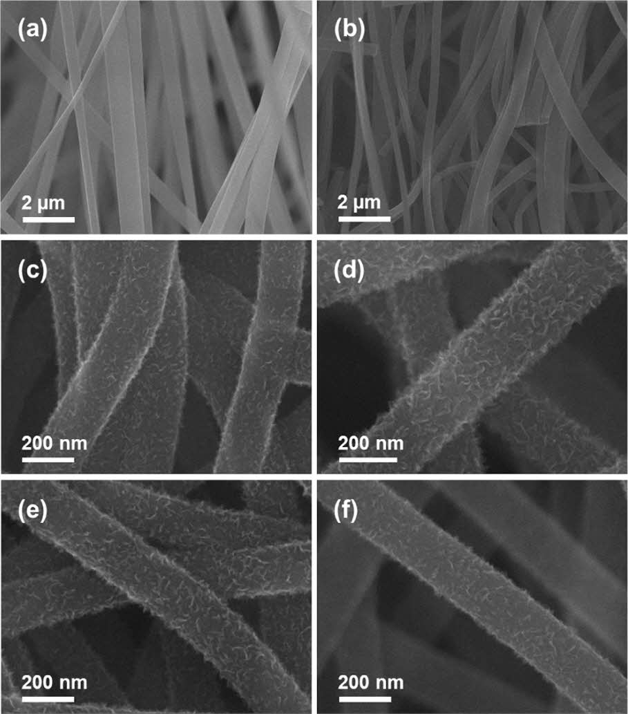 Fig. 2 SEM images of samples: (a) PAN nanofibers. (b) Carbon nanofibers synthesized at 1040oC. (c) Pristine VG@CNFs without doping. (d-f) VG@CNFs with S-doping at (d) 800oC, (e) 900oC, and (f) 1000oC. |