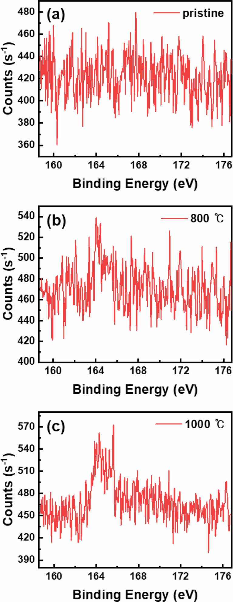Fig. 4 XPS S 2p spectra of (a) pristine VG@CNFs and (b, c) VG@CNFs with S-doping at (b) 800oC, and (c) 1000oC |