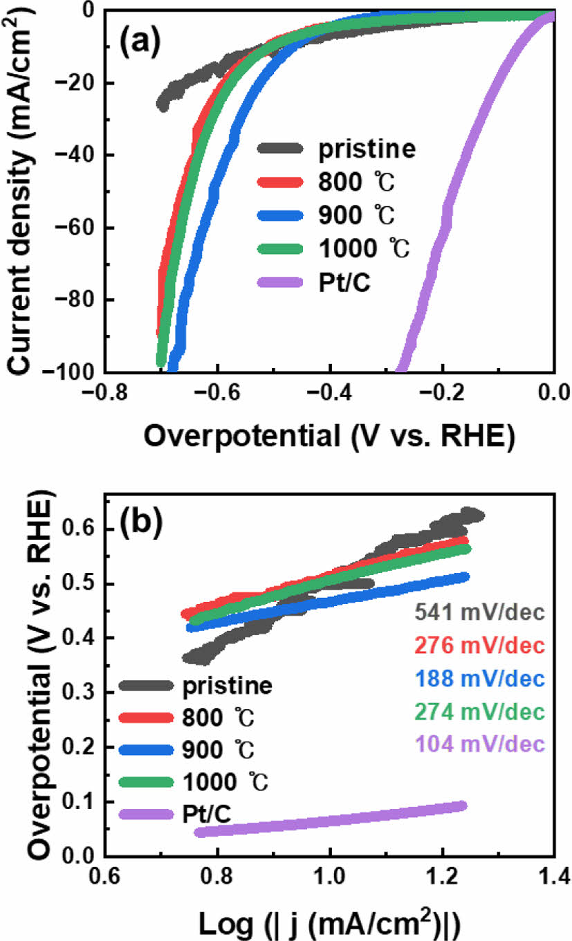 이러한 경향은 타펠 기울기에서도 일관되게 나타났다(Fig. 6b). 900oC 샘플의 타펠 기울기는 188 mV/dec로 가장 낮은 값을 보이는 반면, 800oC와 1000oC 샘플은 각각 276 mV/dec와 274 mV/dec로 유사하게 높은 값을 나타냈다. 이는 900oC 조건에서 열처리된 샘플이 HER을 촉진하는 데 가장 적합한 화학적 결함을 제공한다는 것을 나타낸다.