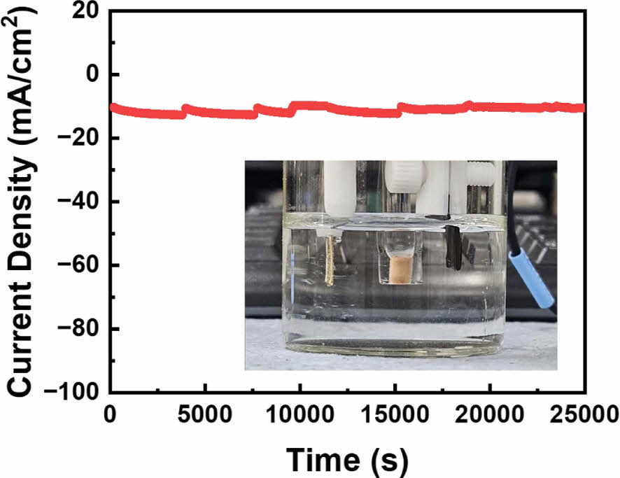 성능을 평가하기 위해 선형스윕전압법(LSV, linear sweep voltammetry)을 0.1~-0.7 VRHE 전압 범위에서 2 mV/s의 전압 주사 속도로 수행하였으며, 촉매의 저항만을 고려할 수 있도록 iR 보정이 95%로 적용되었다. 또한, 전기화학적 임피던스 분광법(EIS, electrochemical impedance spectroscopy)을 -200 mVRHE에서 진폭 ±5 mV로 10 mHz~100 kHz 범위에서 수행하여, Rs를 확인하고 iR 보정에 사용하였다.