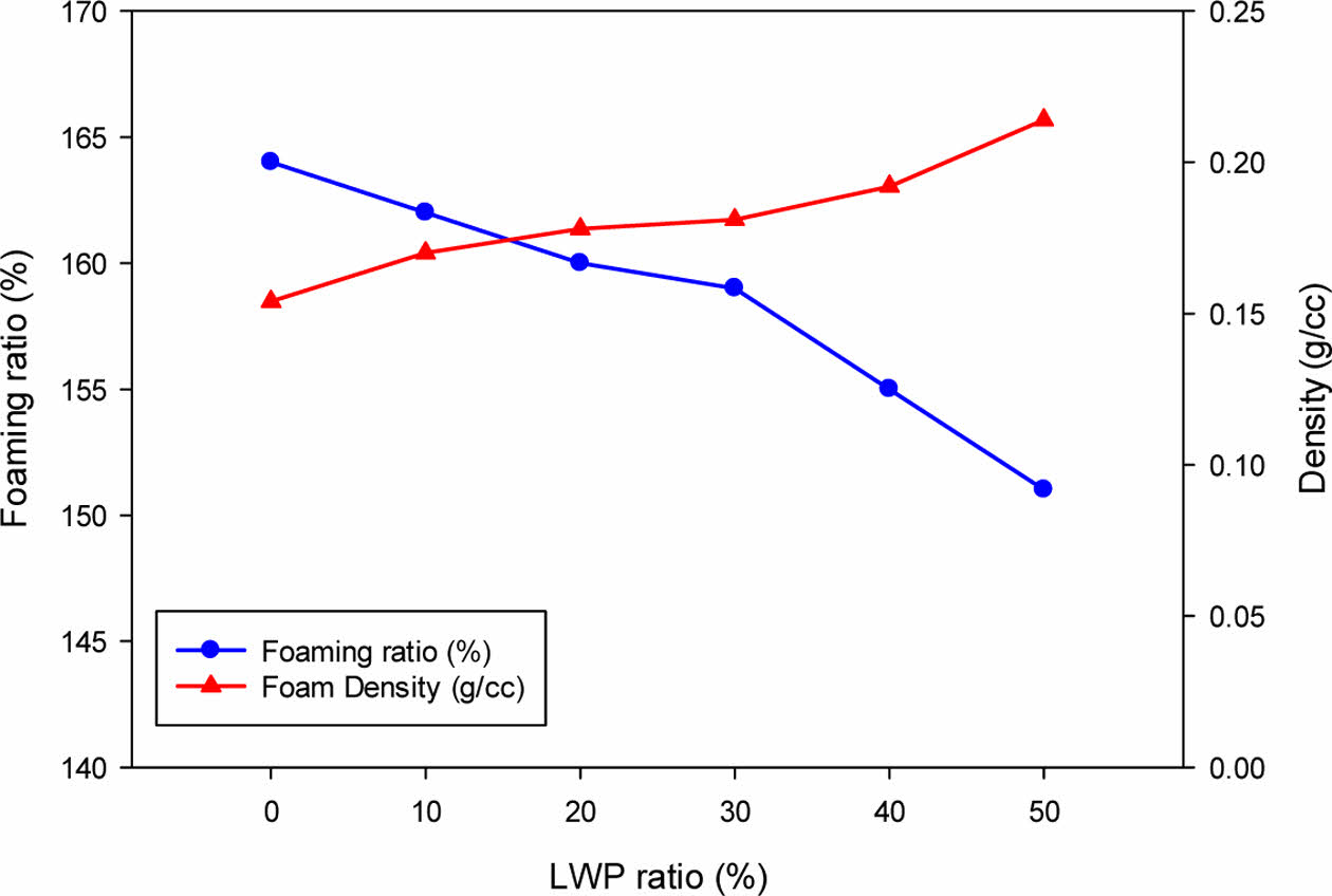 The specific gravity and foaming ratio exhibited an inverse relationship, with the specific gravity increasing as the foaming ratio decreased. This trend highlights the impact of LWP addition on the foaming characteristics and the lightweight properties of the foams.