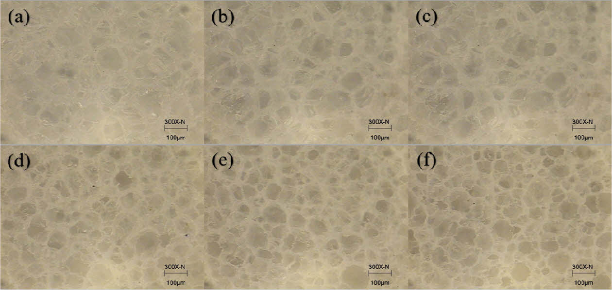 Fig. 3 Morphologies on the cross section of the EVA and EVA/ LWP composite foams; (a) EVR 00, (b) EVR 10, (c) EVR 20, (d) EVR 30, (e) EVR 40, (f) EVR 50. The scale bar is 100 μm |