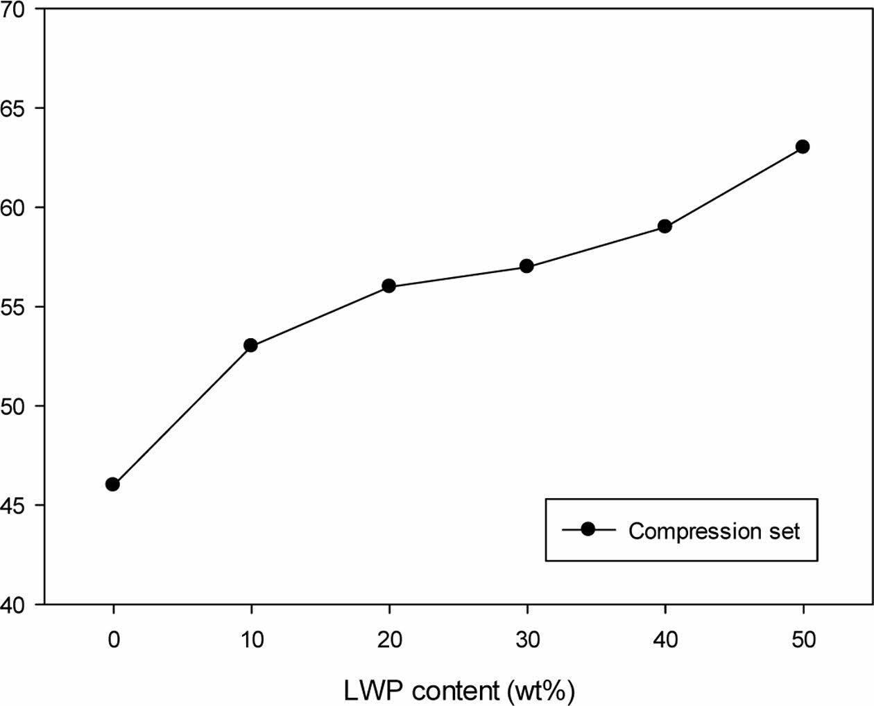 The permanent compression set of each foam was measured, and the results are presented in Fig. 7. The data showed that as the LWP content increased, the permanent compression set value also increased. This indicates a deterioration in the foam’s recovery performance and an increase in permanent deformation after compression.