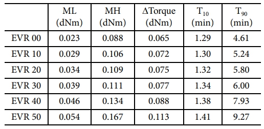 Fig. 1 and Table 2 present the results of the crosslinking characteristics of EVA and EVA/LWP foams measured using an ODR. The scorch time (T10) was approximately 1 minute, and it showed minimal variation with increasing LWP content, indicating that the initial crosslinking reaction was not significantly affected.