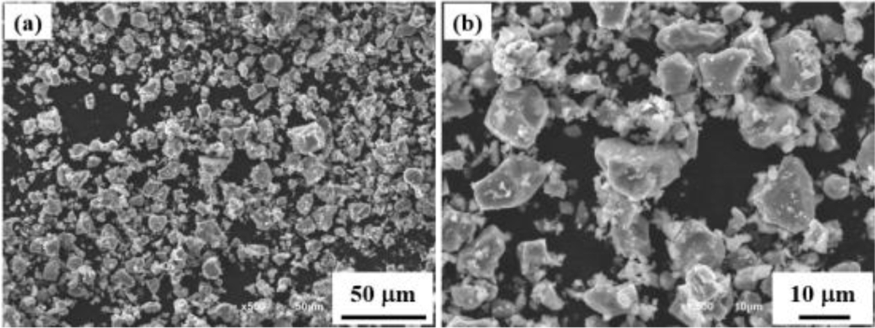 강화재로는 평균 입도 10 μm의 TiC 분말(Changsha Langfeng Metal Materials Co., Ltd.)을 사용하였으며, 주사전사현미경(SEM)으로 관찰한 분말의 형상을 Fig. 1에 나타내었다.