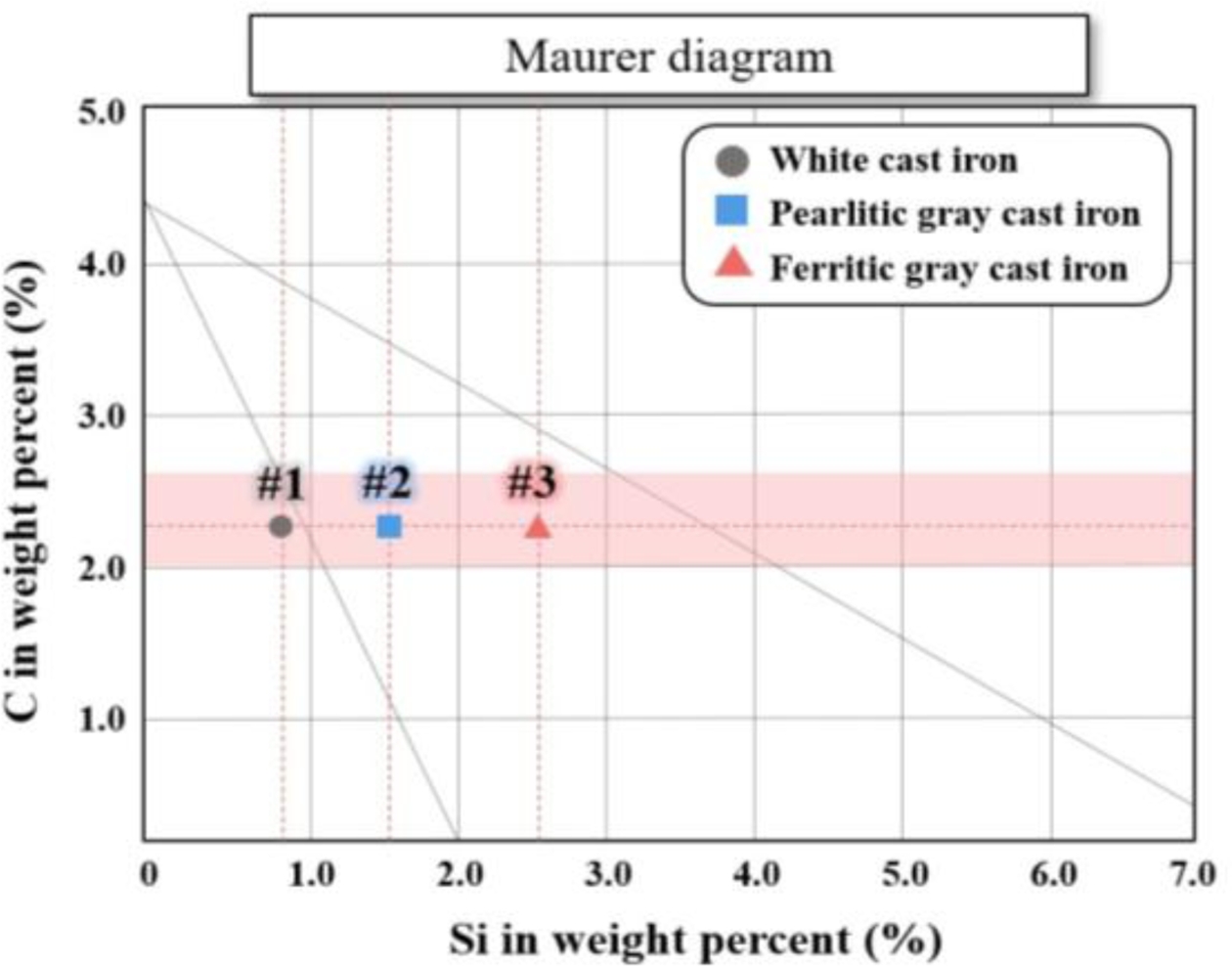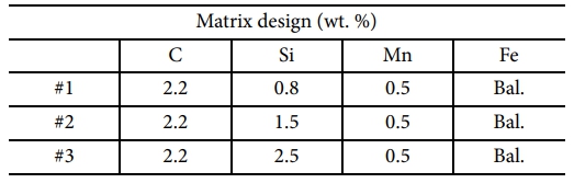 금속 기지재로는 저탄소강 (S20C)을 기반으로 하였으며, Fig. 2에 제시한 Maurer diagram을 참고하여 C와 Si 함량을 설계하였다. 설계한 조성의 원료를 도가니에 장입한 후 진공로에서 1600oC로 용융하여 Si 함량이 서로 다른 기지재를 제조하였다. 최종 기지 금속의 조성은 Table 1에 나타내었다.