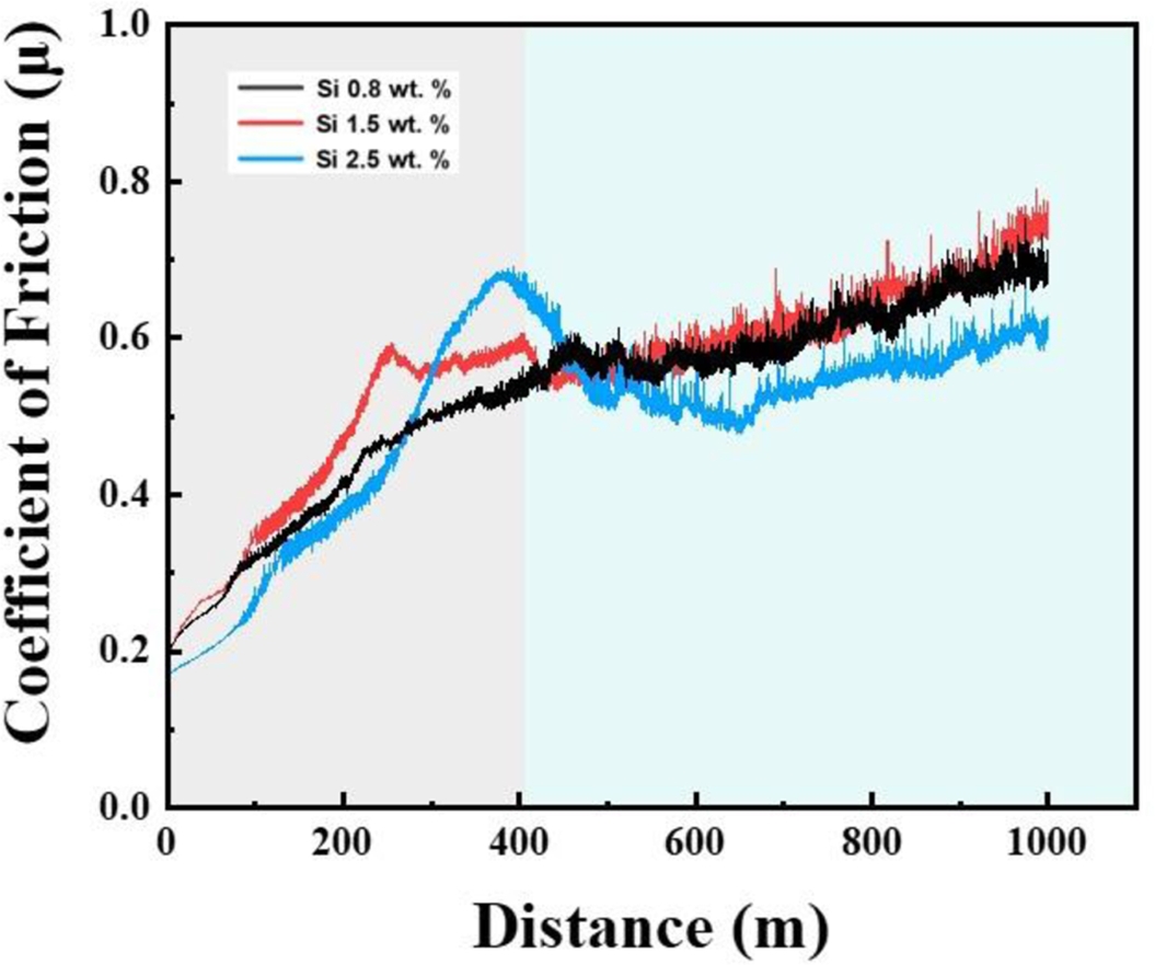 Fig. 6의 마찰계수 결과를 보면, 세가지 시편 중 Si함량이 가장 높은 2.5 wt.% 시편의 마찰계수가 가장 낮게 나타난 것을 확인할 수 있으며, 이는 마찰과정에서 형성된 MML층의 안정성과 윤활 성능에 기인한다.