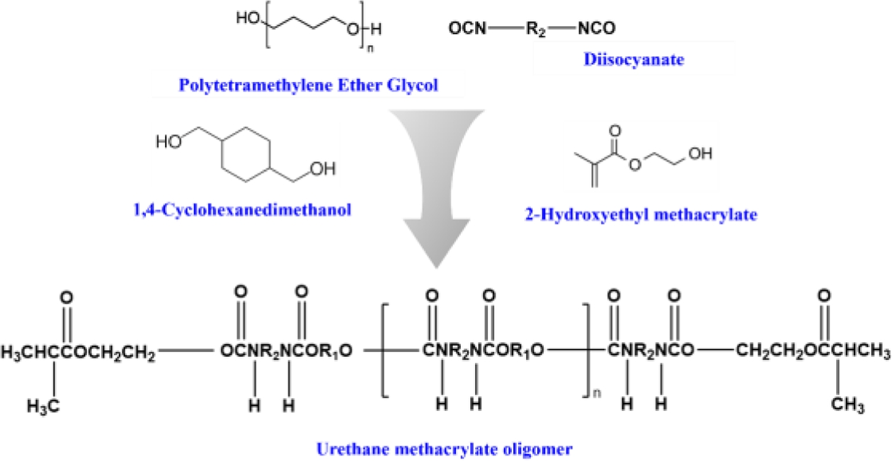 The oligomers used in this study are urethane acrylate oligomers. Urethane linkages are synthesized through the addition polymerization reaction between polyols, isocyanates (-N=C=O), and active hydroxyl groups (-OH), resulting in the release of reaction heat. Bifunctional diols play a crucial role in this process, serving as chain extenders and forming compounds with the [-NHCOO-]n structure, which are referred to as urethane linkages. When n exceeds 1000, the compound is defined as polyurethane.