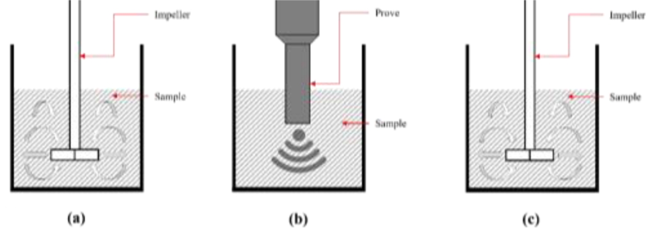 Fig. 3 (a) 1st stirring process with 1,500 rpm, 30 min at 60oC (b) Ultrasonication process with 1.5 h by 6s pulse and 4s cooling, (c) 2nd stirring process with 1500 rpm, 3 h at 25oC |