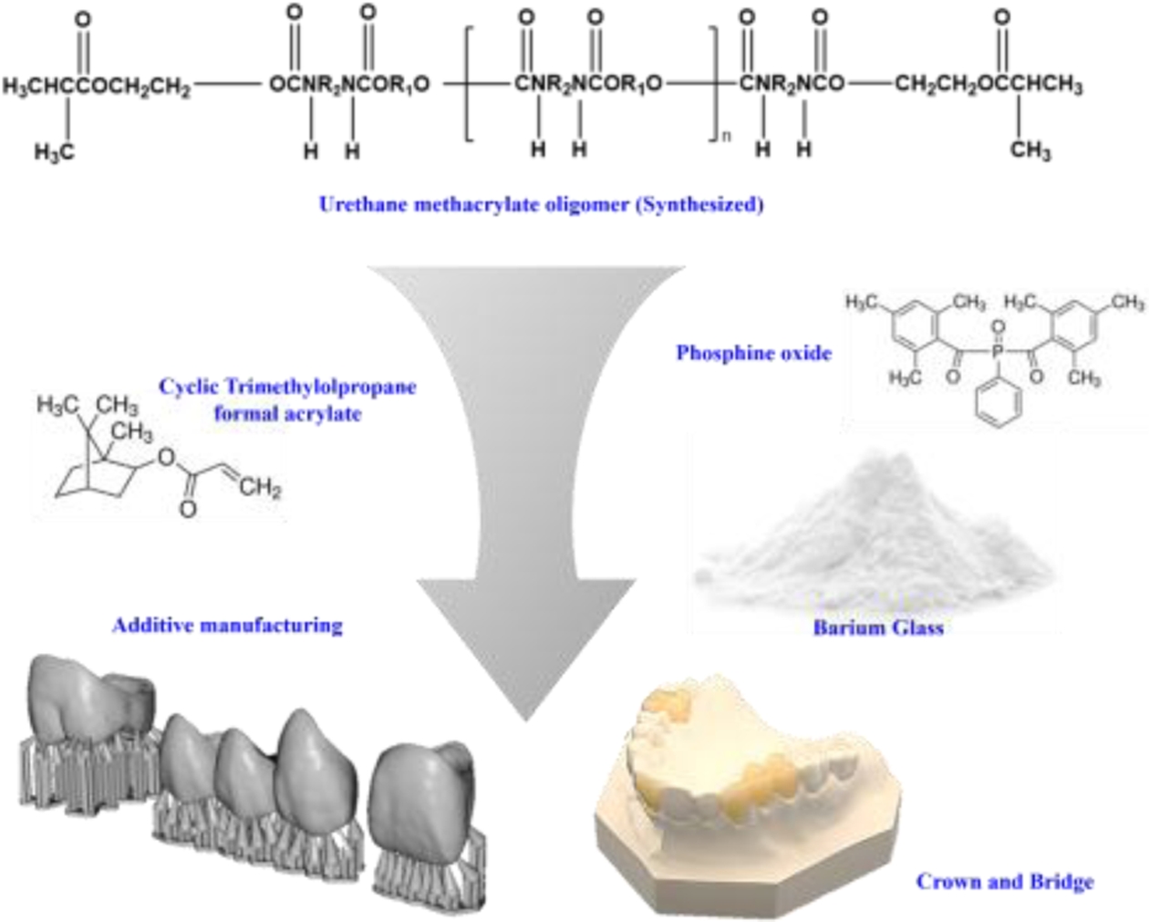 To achieve an A2 shade similar to natural teeth, the synthesized oligomers, monomers, photo initiators, and two types of organic pigments were mixed, with their types, chemical structures, and average molecular weights summarized in Table 1. Barium glass was added to the photocurable resin in varying proportions to create five sample compositions, R100:B0, R95:B5, R90:B10, R85:B15 and R80:B20, which were then used for comparative analysis of mechanical properties.