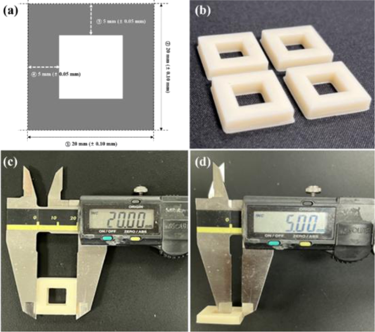 To determine the optimal 3D printing conditions, the UV exposure times were varied at 1.9 s, 2.0 s, and 2.1 s to measure dimensions. Fig. 5(a) shows a rectangular donut specimen designed according to ISO 2768 with an outer length of 20 mm and an inner wall width of 5 mm [20], applying allowable deviations based on each tolerance standard. The specimens cured with the varied exposure times are presented in Fig. 5(b). After the layer curing and post-curing, dimensions were measured at four locations using a Vernier caliper, and the results are shown in Fig. 5(c) and Fig. 5(d).