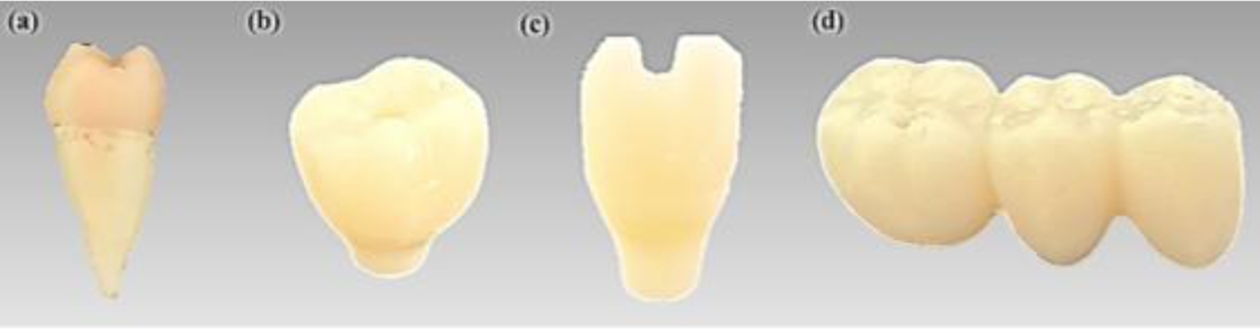 Fig. 6 (a) Extracted natural crown, (b) 3D printed artificial second molar crown, (c) 3D printed artificial lateral incisor crown, (d) 3D printed 3-unit bridge |