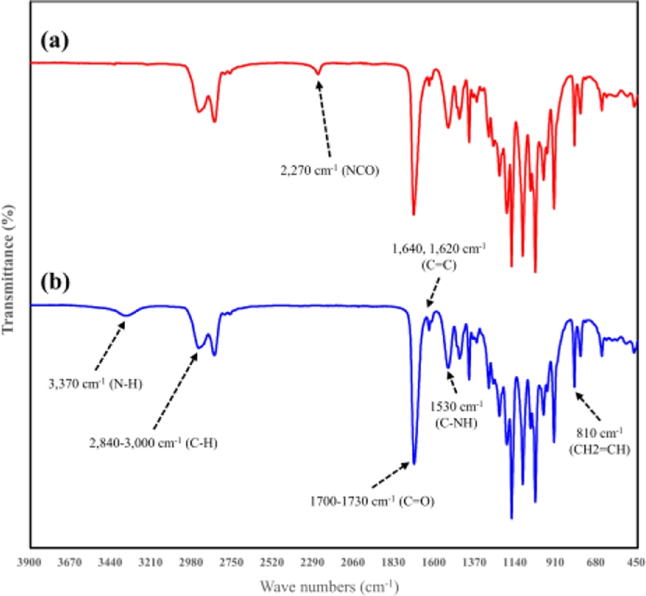 The IR spectrum during the synthesis of photopolymerizable urethane acrylate oligomers is shown in Fig. 7. In panel (a), the spectrum illustrates the formation of a prepolymer with NCO terminal groups, resulting from the reaction between polyol and isocyanate. The characteristic peak of isocyanate (NCO) appears at 2,270 cm-1 [23], while the C-H stretching vibration peaks are observed in the range of 2,840–3,000 cm-1.