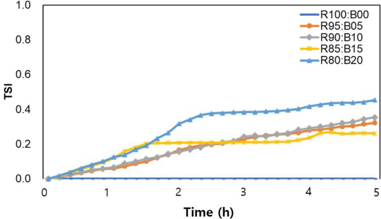 Based on this, the changes in dispersion stability corresponding to varying contents of surface-modified Barium glass were analyzed using the Turbiscan Stability Index (TSI), as shown in Fig. 10 [25]. The results indicate that the R85:B15 composition exhibited the best dispersion stability during the 5-h experiment. In compositions with 5-10% modified Barium glass, the TSI index increased over time; however, initially, it remained lower than the 15% composition, suggesting that dispersion was maintained. Notably, after 3 h, the TSI index for these compositions surpassed that of the 15% composition. In contrast, when the particle ratio increased to 20%, the TSI index experienced the most significant rise, indicating substantial changes in the sample due to reduced dispersion stability. Ultimately, these findings demonstrate that the surface-modified Barium glass powder can maintain good dispersion stability at levels up to 15%.